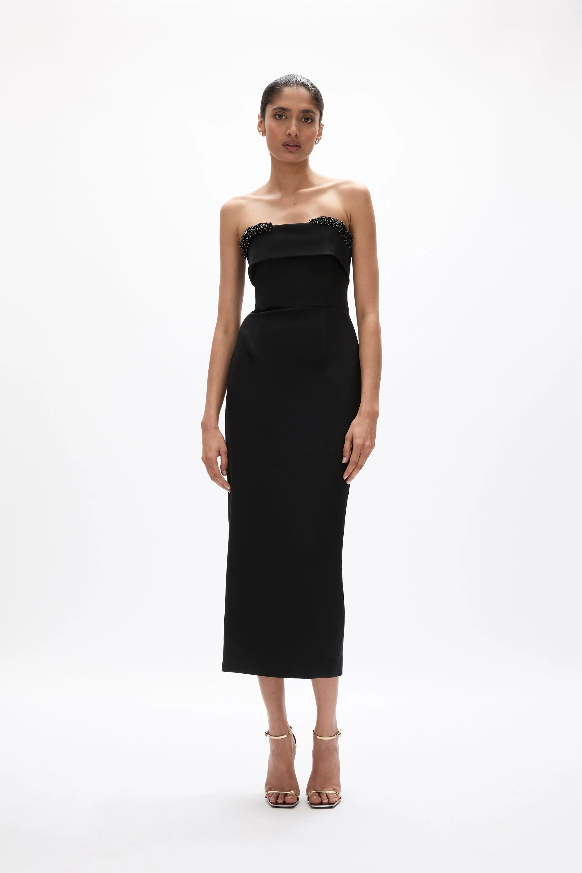 Details & Fit Form fitting strapless silhouette. Model is 5'10 and wears a RG 0 = US 2 = AU/UK 6 •• Internal bodice and corset. • Internal elastic waist tape. • Little stretch through the waist and bust. • Invisible zip. • Back split. • Slight sheen to fabric. • Hand embellished details across the bust. • Strapless silhouette. Fabric & Care Crepe back satin with light sheen 82% Acetate 18% Polyester Dry Clean Only. We recommend covering the beaded trim during care.
