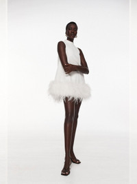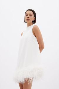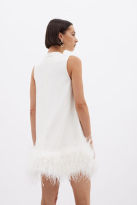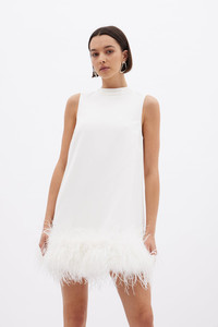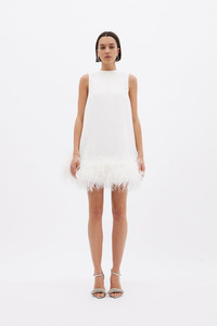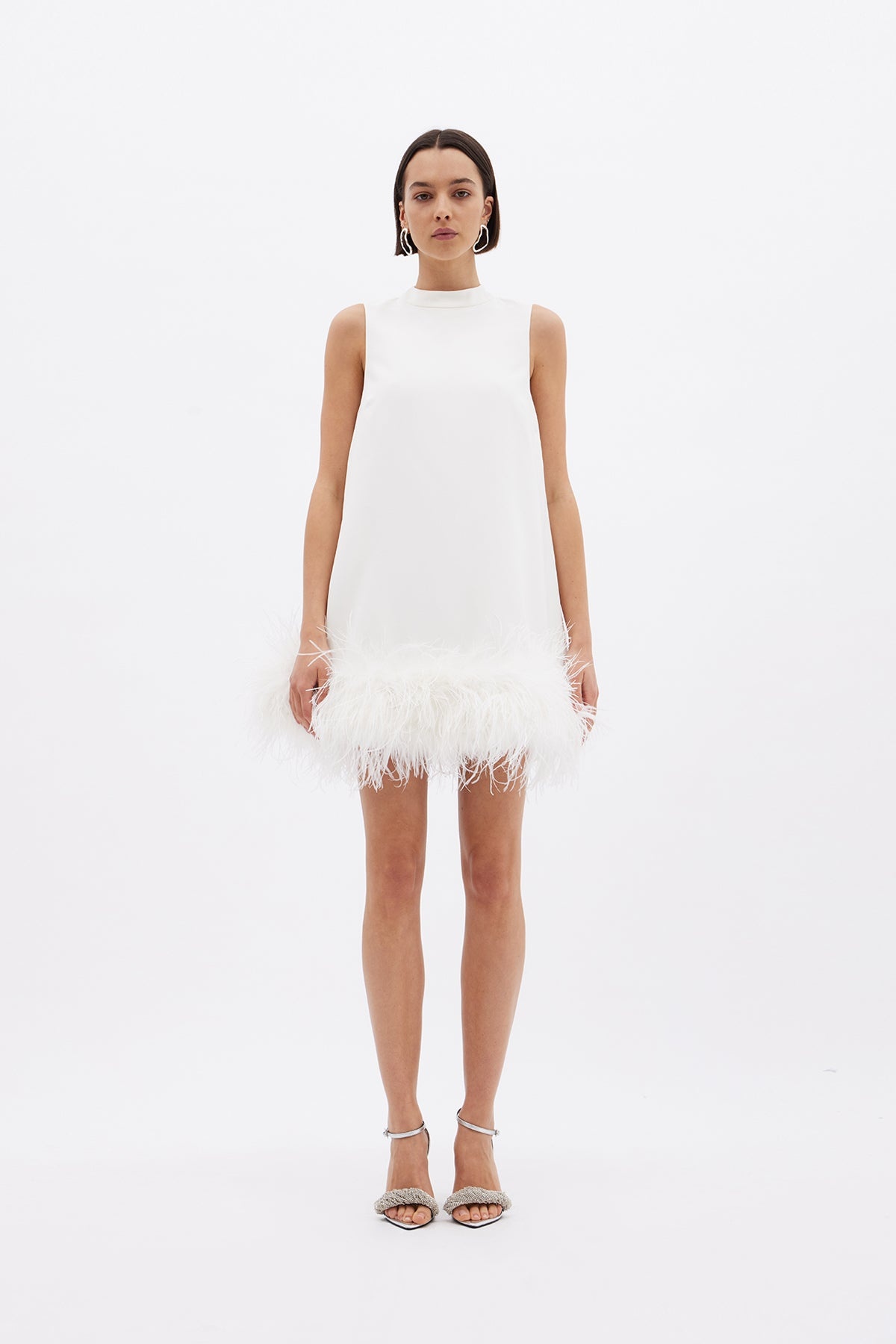 An update to the quintessential mini featuring a raised neckline and ostrich feather hemline cut to a flattering a-line silhouette. Size and Fit Runs true to size, we recommend taking your usual size. Model is 5'9 and wears a Rachel Gilbert Size 1 [AU/UK 8 | US 4] Fabrication Ostrich Feather Stretch Bonded Crepe 95% Polyester 5% Elastane Care Dry clean only See sewn-in label for care instructions