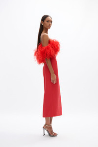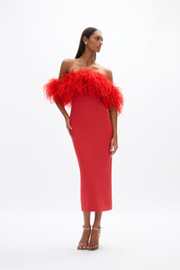 Lending inspiration from our best-selling and signature Linc Gown, the Link Dress boasts a feather bust over a timeless column silhouette. Designed to met in the middle of modern extravagance and timeless elegance making an event staple for seasons to come. Size and Fit Runs true to size, we recommend taking your usual size. Model is 5'9 and wears a Rachel Gilbert Size 1 [AU/UK 8 | US 4]. - Light stretch crepe fabrication - Fitted bodice - Midi length - Off the shoulder strapless silhouette - Fully boned - Adjustable elastic waist tape to cinch in the waist - Silicone taping on the inside of the bust for a firm hold on the body - Ostrich feathers Fabrication Light Stretch Crepe Main: 93% Polyester 7% Spandex Lining: 100% Polyester Care Dry Clean Only See sewn in label for further care instructions
