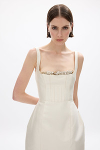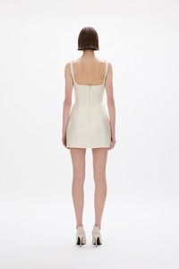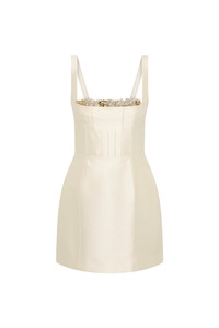 Details & Fit This style is true to size; we recommend using your bust, waist, and hip measurements to select the size that most closely matches our size chart.Mini silhouette Form fitting Square neckline Internal power mesh bodice and corest Hand-placed embellished trim along neckline Skirt designed to sit slightly off the body No stretch through the body Back zip closureModel is 5'9 and wears size RG 0 / US 2 Fabric & Care Fabrication: 52% Wool, 48% Silk Care: Dry Clean Only Crafted from a silk-wool blend, the Ludovica Trim Mini has a soft hand feel and subtle sheen. The fabric drapes gracefully while maintaining structure, supporting the silhouette and hand-applied embellishments at the neckline. To protect the detailing, avoid rough surfaces and jewellery, and store in a garment bag using internal loops.