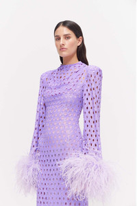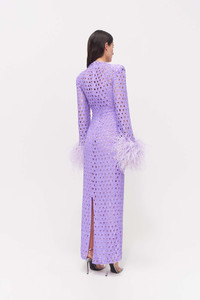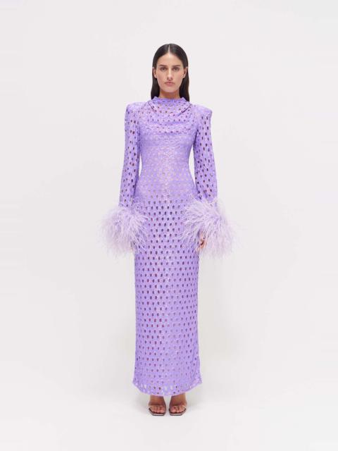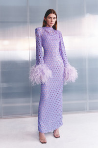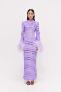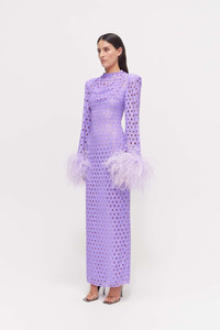 Sophisticated and chic, the Mara Gown is a full-length, hand embellished long sleeve netted sequin gown, complete with feathered cuffs. With built in shoulder pads and a cinched waist to create a timelessly flattering silhouette, the Mara Gown is sophisticated and elevated. - Internal shoulder pads - Fabric tucks on the shoulders - High collar - Feather detailing on the cuffs - Centre back zip - Separate slip to be worn underneath with adjustable straps and a centre back zip - Honeycomb cut outs with hand sequinned fabric - This garment runs true to size Size and Fit Runs true to size, we recommend taking your usual size. Model is 5'10 and wears a Size 1 Fabrication Embellished 100% Polyester Care Dry Clean Only See sewn in label for further care instructions
