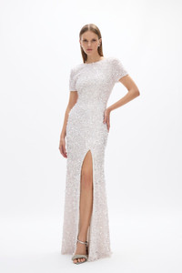 Details & Fit This is an a-line gown silhouette. Model is 5'10 and wears a RG 1 = US 4 = AU/UK 8 • Hand embellished. • Fully lined. • Mid-thigh split. • Back Zip. • Internal corset and bodice. • Little stretch through the waist. • Light stretch through the hips. • Short sleeves. • Rounded neckline. Fabric & Care Embellished Main: 100% Nylon Tulle Lining: 100% Nylon Dry clean only See sewn-in label for care instructions