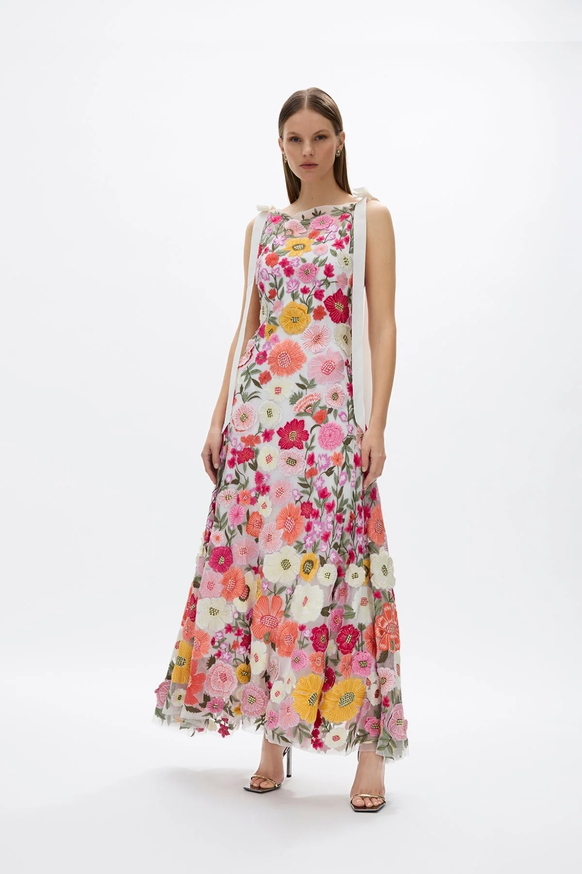 The statement silhouette of the season, the Nya Gown focuses on craftsmanship, featuring hand embroidered florals across a floor grazing silhouette. Complete with bow detail ribbon shoulder straps, and a cinched waist to accentuate shape. This style is sold with a slip. Details & Fit Runs true to size, we recommend taking the size closest to your bust & waist measurements. Model is 5'10 and wears a RG 1 = US 4 = AU/UK 8. - Hand embroidered - Maxi length - A-line shift silhouette - Ribbon ties on shoulders - Back zip closure - Ivory slip included Fabric & Care Embroidered Tulle Main: 100% Nylon Tulle Lining: 100% Nylon Dry clean only See sewn in label for further care instructions