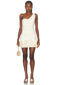 Details - Self: 50% polyester, 45% nylon, 5% elastane - Made in China - Dry clean only - Fully lined - Hidden back zipper closure - One-shoulder design - Pleated sateen fabric with structured swirl design at hem - Our Style No. RERF-WD44 - Manufacturer Style No. 24SSRG61879.CON