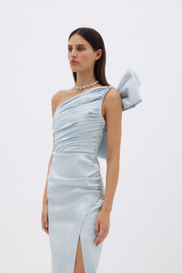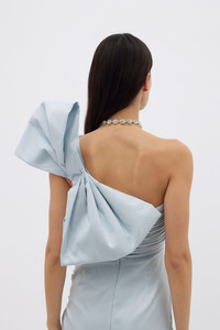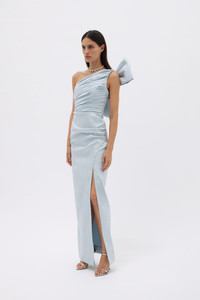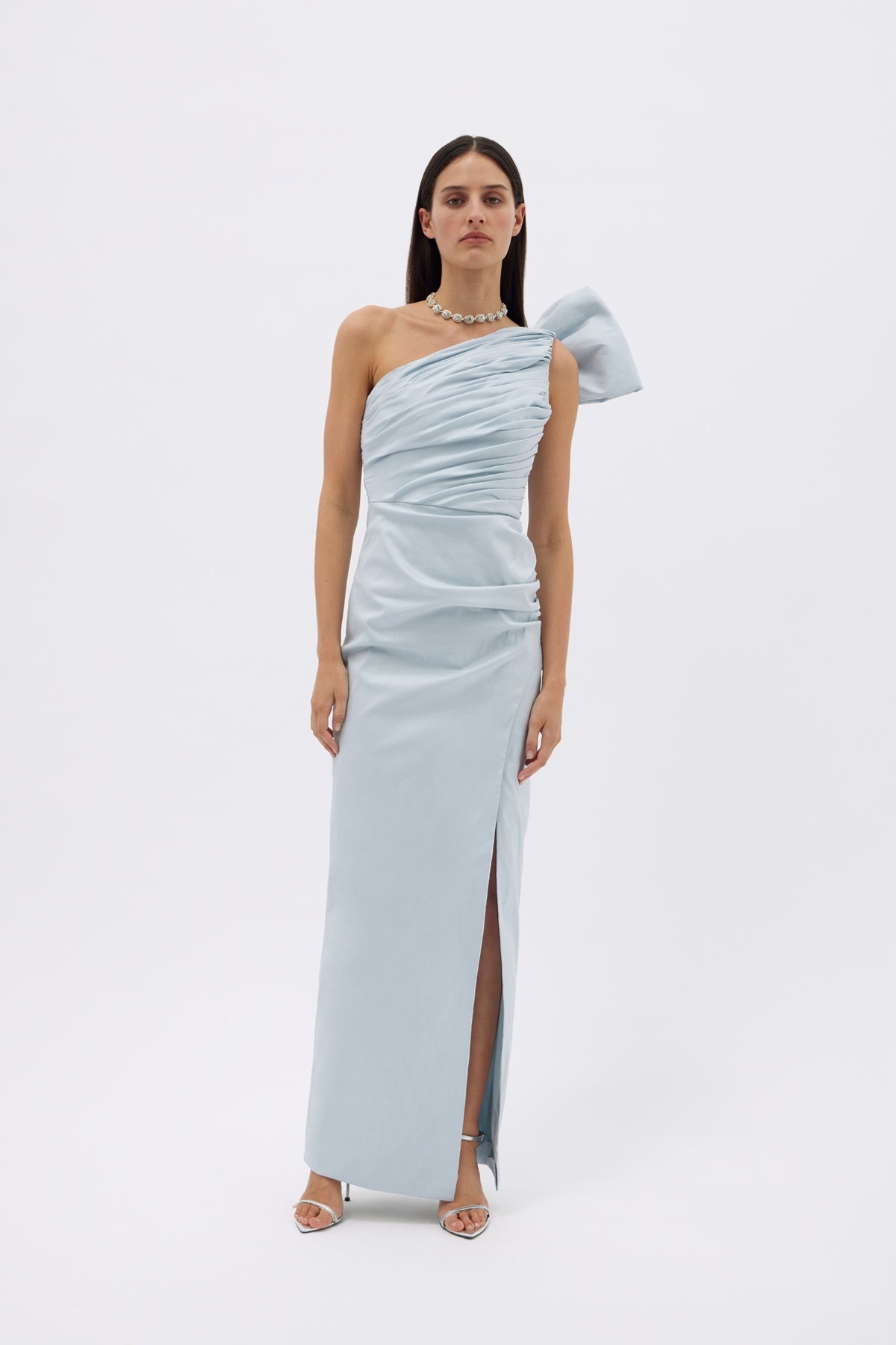 Reinventing a classic one-shoulder silhouette the Olive Gown features a sculptural bow stitched to the back shoulder. Designed with the female form in mind, the Olive Gown features internal corsetry to define the waistline as well as an intentionally draped waistline. This silhouette is fully lined and is fastened by an invisible zip closure with a side split to balance shape. - Fitted bodice with internal boning - Fits true to size -This fabric has stretch - A slim fit silhouette - Adjustable elastic waist tape to cinch in the waist - One shoulder style can be altered for a closer fit - Bow can be removed by unpicking the stitch - This style can be hemmed Size and Fit Runs true to size, we recommend taking your usual size. Model is 5'9 and wears a Rachel Gilbert Size 1 [AU/UK 8 | US 4] Fabrication Stretch Taffeta 50% Polyester 45% Nylon 5% Elastane Care Dry Clean Only See sewn-in label for further care instructions