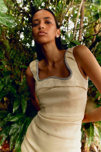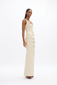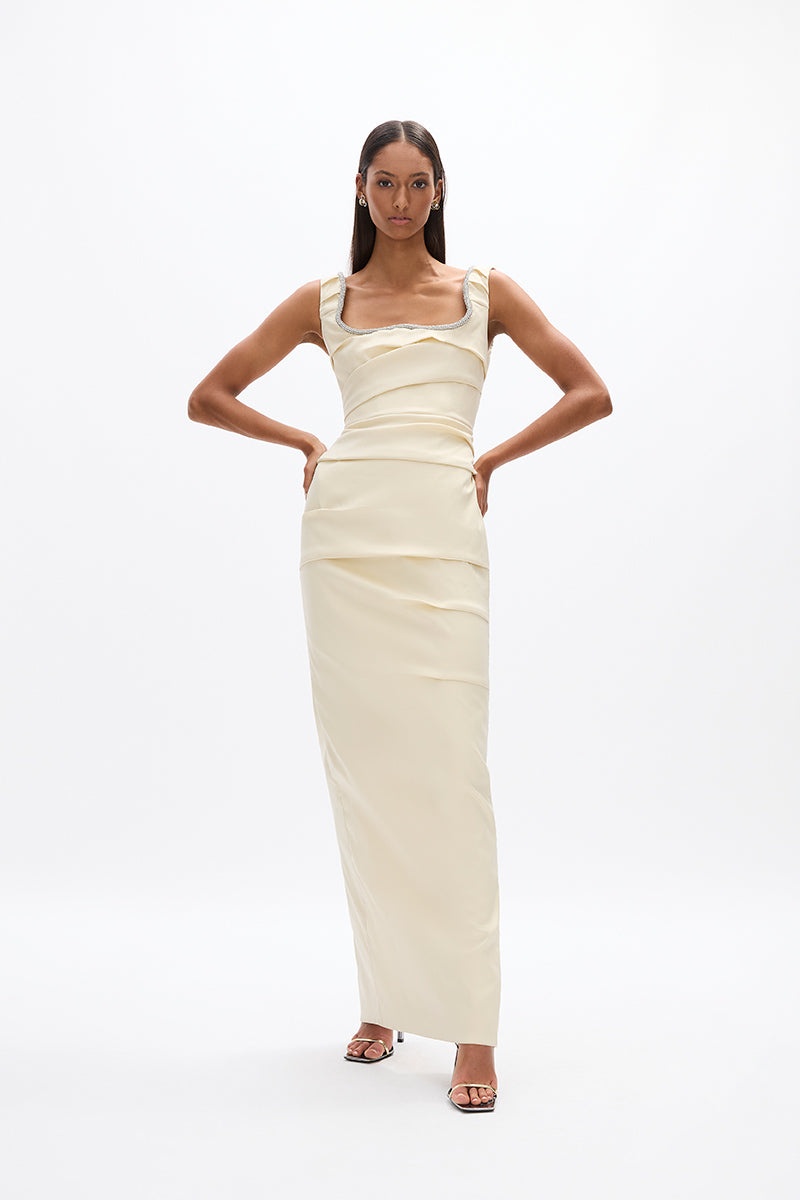 A style update to a signature fabrication, the Onyx Gown is crafted from a stretch taffeta and adorned with an embellished detailed neckline. Internally structured with corsetry and waist tapes to define shape, the onyx gown balances a classic silhouette with signature Rachel Gilbert embellishment. Styled with the Waverly Earring. Size and Fit Runs true to size, we recommend taking your usual size. Model is 5'10 and wears a RG 1 = US 4 = AU/UK 8. - Fitted silhouette - Embellished trim along neckline - Full length - Shaped neckline - Sleeveless - Fully boned - Adjustable elastic waist tape to cinch in the waist - Silicone taping on the inside of the bust for a firm hold on the body Fabrication Taffeta Main: 45% Nylon 50% Polyester Lining: 100% Polyester Care Dry Clean Only See sewn in label for further care instructions