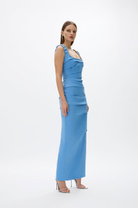 A style update to a signature fabrication, the Onyx Gown is crafted from a stretch taffeta and adorned with an embellished detailed neckline. Internally structured with corsetry and waist tapes to define shape, the onyx gown balances a classic silhouette with signature Rachel Gilbert embellishment. Styled with the Tatum Earring. Size and Fit Runs true to size, we recommend taking your usual size. Model is 5'9 and wears a RG 1 = US 4 = AU/UK 8. - Fitted silhouette - Embellished trim along neckline - Full length - Shaped neckline - Sleeveless - Fully boned - Adjustable elastic waist tape to cinch in the waist - Silicone taping on the inside of the bust for a firm hold on the body Fabrication Taffeta Main: 45% Nylon 50% Polyester Lining: 100% Polyester Care Dry Clean Only See sewn in label for further care instructions