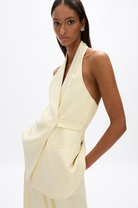 A halter-neck style vest designed to be slightly fitted through the waist to create shape before falling to a relaxed longline fit. Designed as the sartorial solution to take you from day-time soirees to after work drinks. Styled with the Waverly Earring. Size and Fit Runs true to size, we recommend taking your usual size. Model is 5'10 and wears a RG 1 = US 4 = AU/UK 8. - Stretch crepe fabrication - A-line silhouette - Hip length - Halterneck - Sleeveless - Side zip - Hip welt pockets Fabrication Stretch Crepe Main: 96% Viscose 4% Spandex Care Dry Clean Only See sewn in label for further care instructions