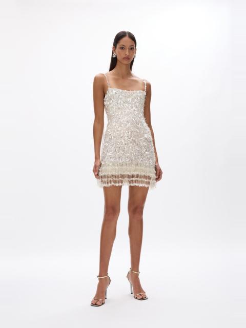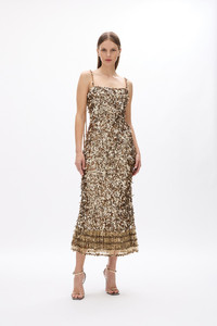 The Posie makes a powerful statement in gold. It’s crafted with subtle straps, a flattering square neckline and a column cut offset with a striped hem. The scattering of luminous sequins will make you opulently stand out at the dining table or dance floor. - Hand embellished detail - Fully boned bodice - Lining is high stretch for sculpting - Internal waist tape to cinch - Self tie straps - Midi length - Tasseled hem edge with fishtail skirt shape - This style fits true to size Size and Fit Runs true to size, we recommend taking your usual size. Model is 5'10 and wears a Rachel Gilbert Size 1 [AU/UK 8 | US 4]. Fabrication Embellished Tulle 100% Nylon Care Dry Clean Only See sewn in label for further care instructions