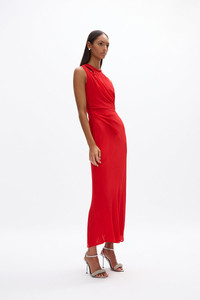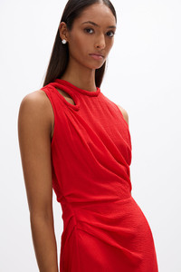 A must have for your summer wardrobe, the Quinn Dress is sleeveless style, with a high neckline and slight fabric draping across the bodice. Light-weight and airy, the Quinn Dress will be your go to piece throughout the warmer months. Size and Fit Runs true to size, we recommend taking your usual size. Model is 5'10 and wears a Rachel Gilbert Size 1 [AU/UK 8 | US 4]. - Hand twisted draping around neckline - Sheer style - Fitted waist, not designed to be skin tight - Skims the body - Cut on the bias - Centre back zip closure - Mid length - Key hole cut out feature on the neckline Fabrication Crinkle Georgette Main: 100% Silk Care Dry Clean Only See sewn in label for further care instructions