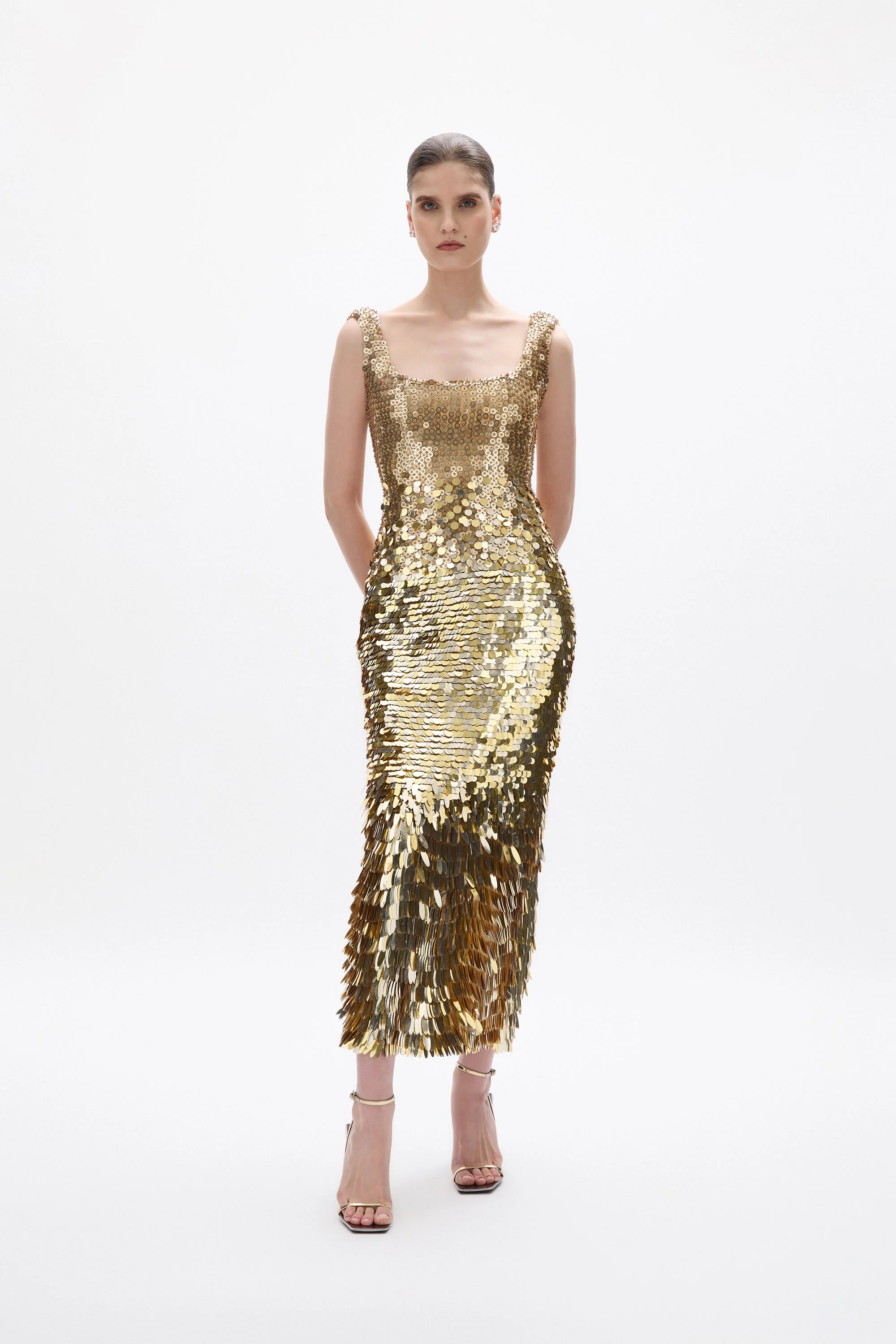 Details & Fit This style fits true to size; we recommend using your bust, waist, and hip measurements to select the size that most closely matches our size chart.Model is 5'8 and wears size RG 0 / US 2 - Full-length column silhouette - Form fitting - Square neckline with thick straps - Internal corset and waist tape - Hand embellished with stacked silver and gold sequins - Each piece is uniquely crafted with individual trims, making every garment subtly one-of-a-kind. - Gentle stretch throughout allows ease of movement - Fully lined - Back zip closure - Back split Fabric & Care Fabrication: Hand-Embellished Nylon Tulle – 100% Nylon Care: Spot Clean Only - Do not dry clean or steam. See care label for further instructions Crafted from Nylon Tulle, this lightweight mesh provides a supportive structure for detailed hand-beading. Each sequin is individually applied to give dimension and subtle weight, while maintaining a soft, fluid drape. To preserve the embellishment, avoid contact with rough surfaces, take care with jewellery, and store the gown in a garment bag using internal support loops when hanging.