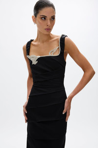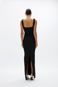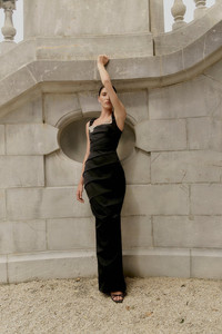 A nod to timeless elegance, the Rhode Gown features signature Rachel Gilbert draping, designed to form and flatter complete with seasonally inspired hand beaded embellishment representing a floral and vine motif across the bust line. Details & Fit Runs true to size, we recommend taking your usual size. Model is 5'10 and wears a RG 1 = US 4 = AU/UK 8. - Fitted column silhouette - Full length - Square neckline - Internal boning in bodice - Hand beaded trim across front neckline Fabric & Care Bonded Satin Main: 96% Rayon 4% Spandex Lining: 88% Acetate 12% Polyester Dry clean only See sewn in label for further care instructions