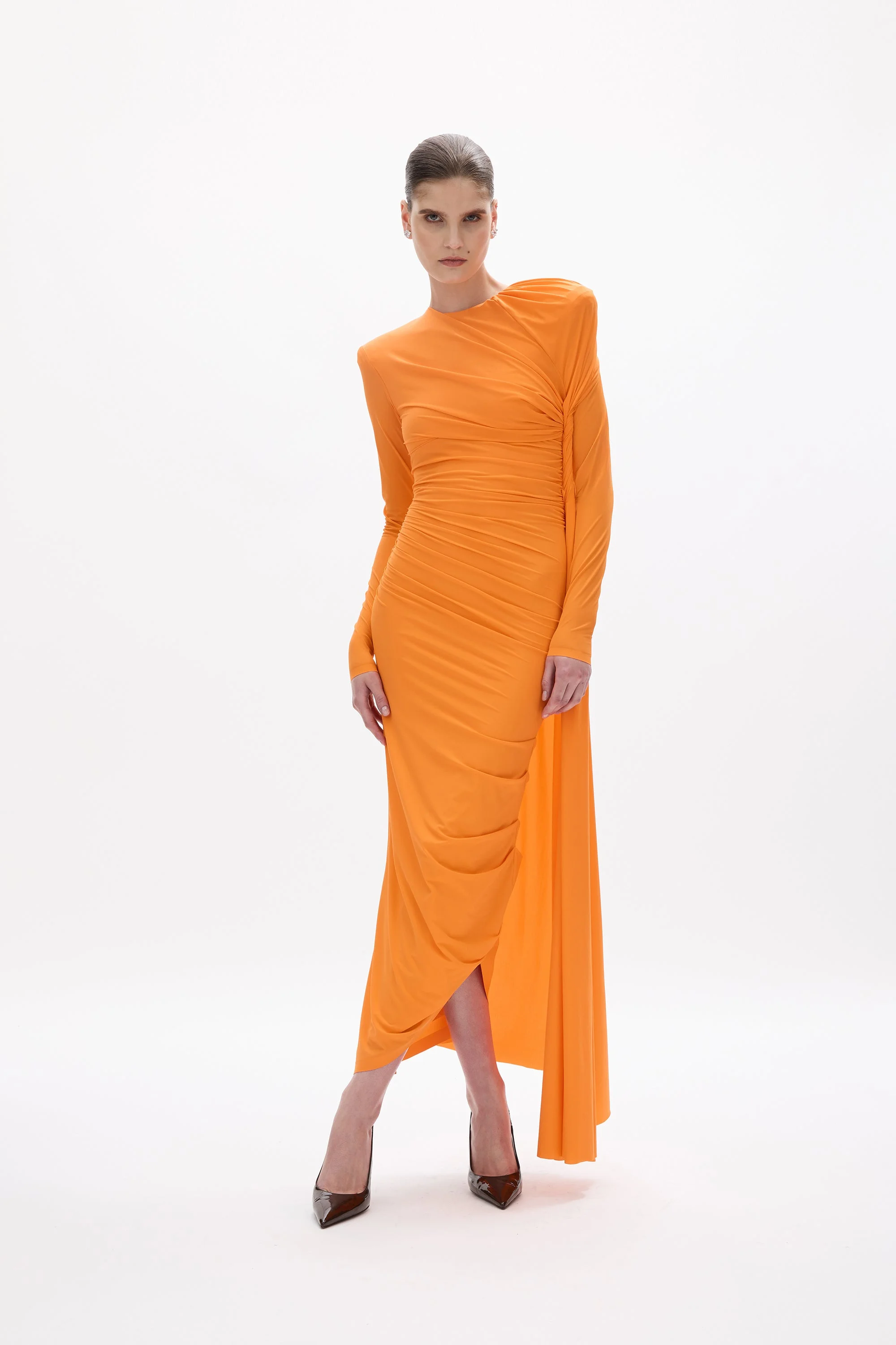 Details & Fit This style fits true to size; we recommend using your bust, waist, and hip measurements to select the size that most closely matches our size chart.Model is 5'8 and wears size RG 0 / US 2 - Midi silhouette - High neckline - Form fitting through bust and waist - Hand-draped ruching across bust and waist - Internal shoulder pads for structure - Side ankle-length train - Back zip Fabric & Care Fabrication: Jersey – 73% Polyamide, 27% Elastane Care: Dry Clean Only Crafted from Italian high-stretch jersey, this fabric provides a smooth, supportive fit with breathable comfort. Its elasticity allows for movement while maintaining the sculpted silhouette. To preserve the ruched detailing and shape, handle with care and store flat or on a hanger inside a garment bag.