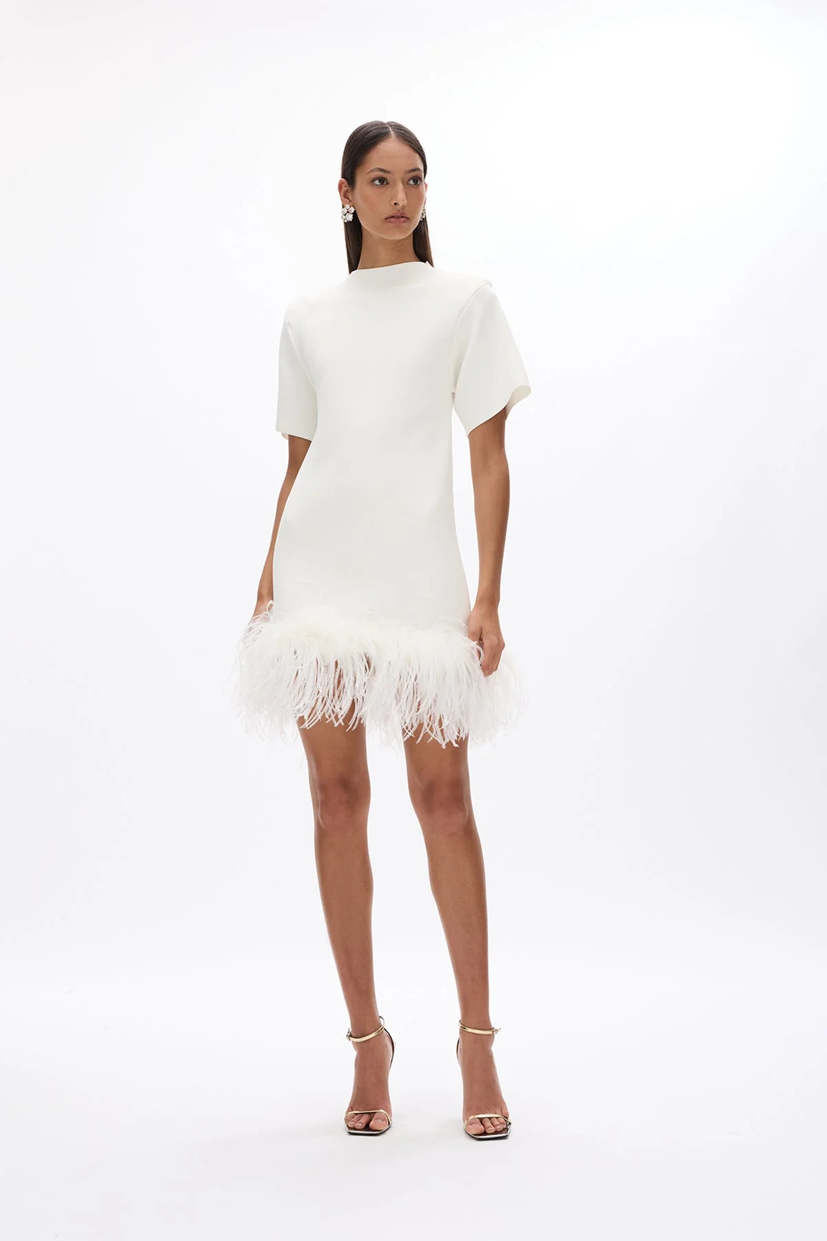 Inspired by the best-selling Linc mini, the Rita Mini is nothing short of a sartorial sensation. Made from ivory crepe, it has a modern turtleneck and cascades to an A-line hem. The floaty feathers will enhance movement on the dancefloor or at dinner. - Thick stretch knit - Keyhole & button closure at back neck - Shoulder pads - Mini length A-line skirt - Ostrich feathers at hem - Feathers can be removed for laundering - Designed to be loose fitting Size and Fit Runs true to size, we recommend taking your usual size. Model is 5'10 and wears a Rachel Gilbert Size S [AU/UK 8 | US 4] Fabrication Crepe Knit 63% Viscose 37% Nylon Crepe Knit Care Dry Clean Only See sewn in label for further care instructions