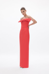 Details & Fit This style fits true to size; we recommend using your bust, waist, and hip measurements to select the size that most closely matches our size chart.Model is 5'8 and wears size RG 0 / US 2 - Full-length column silhouette - Strapless neckline - Hand-draped bow across the bust with shoulder coverage - Form fitting through bust and waist - Fully boned internal corset and structured bodice - Adjustable internal waist tape - Back zip closure - Back split Fabric & Care Fabrication: Stretch Crepe – 98% Polyester, 2% Spandex Care: Dry Clean Only Crafted from stretch crepe, this fabric provides a lightweight yet structured base that supports the internal corsetry and draped details. The slight stretch allows comfort and movement while maintaining the gown’s sculpted silhouette. Store using hanger straps in a garment bag to preserve the hand-draped bow and finish.