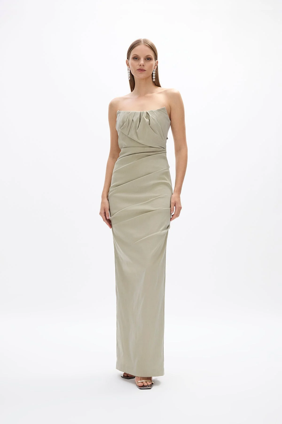 Available for pre-order, shipping October 9th. Designed to define shape & imbue elegance. The Sienna Gown features a strapless, fitted bustier complete with internal boning for additional structure falling to a relaxed slim line silhouette. The Sienna features intentional draping to flatter the female form and replicate effortless movement across the silhouette. This silhouette is fastened by an invisible zip closure and features a back leg split for a balanced shape. - Fitted bodice with internal boning - A slim fit silhouette This fabric has stretch - Adjustable elastic waist tape to cinch in the waist Silicone taping on back neckline for a firm hold on the body - This style can be hemmed - Strapless with peaked neckline - This style fits true to size Size and Fit Runs true to size, we recommend taking your usual size. Model is 5'10 and wears a Rachel Gilbert Size 1 [AU/UK 8 | US 4] Fabrication Stretch Taffeta 45% Nylon 50% Polyester 5% Elastane Care Dry Clean Only See sewn in label for further care instructions
