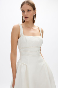 A voluminous, feminine style, the Sophia Strap Dress is a must have for every wardrobe. Featuring a cinched waist alongside a full skirt to create definition and shape. Size and Fit Runs true to size, we recommend taking your usual size. Model is 5'10 and wears a Rachel Gilbert Size 1 [AU/UK 8 | US 4]. - Twisted strap detail - A fit and flare silhouette - Square neckline - Mid length - Voluminous skirt - Back zip closure - No stretch in fabric Fabrication Textured Jacquard Main: 56% Polyester 44% Nylon Care Dry Clean Only See sewn in label for further care instructions