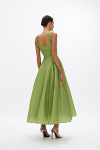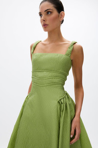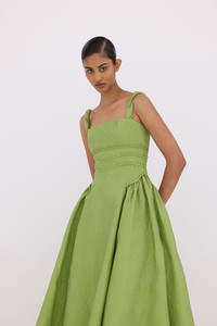 A voluminous, feminine style, the Sophia Strap Dress is a must have for every wardrobe. Featuring a cinched waist alongside a full skirt to create definition and shape. Size and Fit Runs true to size, we recommend taking the size closest to your bust measurements. Model is 5'10 and wears a RG 1 = US 4 = AU/UK 8. - Flared silhouette - Midi length - Voluminous skirt - Square neckline - Twist strap detail - Invisible zip Fabrication Textured Jacquard Main: 56% Polyester 44% Nylon Lining: 100% Polyester Care Dry clean only See sewn in label for further care instructions