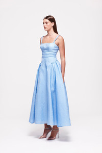 A voluminous, feminine style, the Sophy Strap Dress is a must have for every wardrobe. Featuring a cinched waist alongside a full skirt to create definition and shape. - Twisted strap detail - A fit and flare silhouette - Square neckline - Midi length - Voluminous skirt - No stretch in fabric - Fits true to size Size and Fit Runs true to size, we recommend taking your usual size. Model is 5'9 and wears a Size 1 Fabrication Textured Jacquard 100% Polyester Care Dry Clean Only See sewn-in label for further care instructions