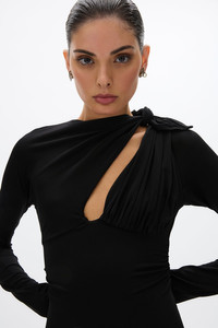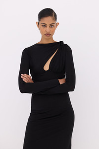 An update to our best-selling Tanner Gown, the Tanner Sleeved Gown is crafted from body-sculpting stretch jersey featuring a key-hole cut out stretching to a self-tie detail. This style features a ruched waist to create a natural hourglass shape before falling to a relaxed column floor grazing length. Size and Fit Runs true to size, we recommend taking your usual size. Model is 5'10 and wears a RG 1 = US 4 = AU/UK 8. - Column silhouette - Full length - Asymmetrical neckline - Key-hole cut out - Long sleeves - Stretch in fabric - Side Split Fabrication Jersey Main: 90% Polyester 10% Spandex Care Dry clean only See sewn in label for further care instructions