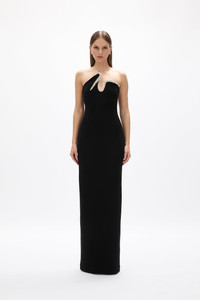 Details & Fit The is a form fitting column silhouette. Model is 5'10 and wears a RG 1 = US 4 = AU/UK 8 • Internal corset. • Elastic waist tape. • Little stretch through the waist and bust. • Slight give through hips • Black Split. • Hand embellished trim across bust. • U shape cut out. Fabric & Care Structured stretch crepe 71% Acetate 29% Polyester Dry Clean Only. We recommend covering the hand embellished trim during garment care.