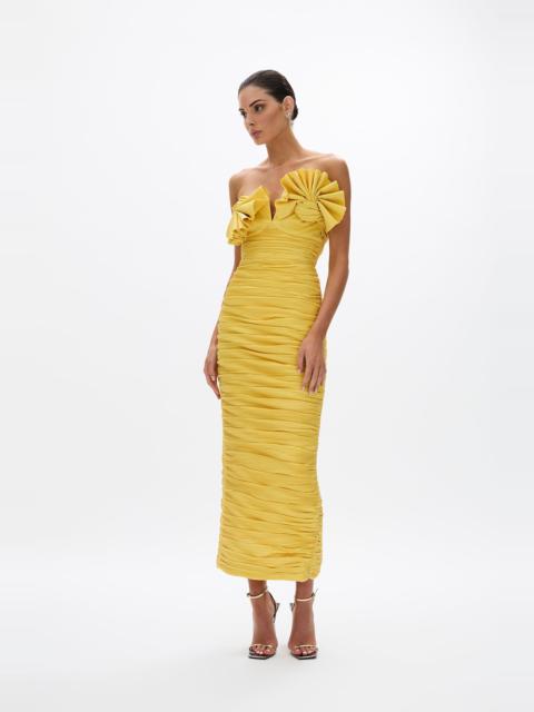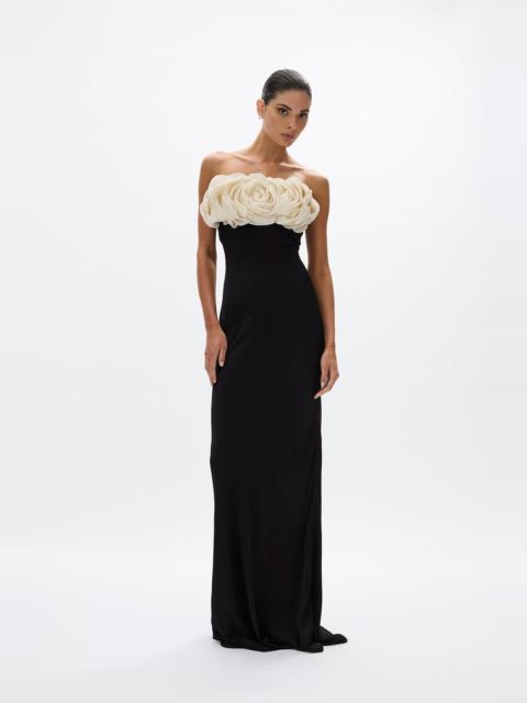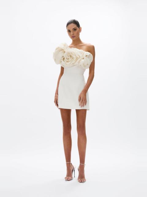 Details & Fit This style is a strapless mini silhouette. • Fitting through the bust and waist. • No stretch through the bust and waist. • Hand draped and placed silk organza floral bust detail. • EInternal corset and bodice. • Internal waist tape. • Back Zip. • Relaxed fitting skirt designed to sit slightly off the body. Fabric & Care Stretch Crepe Main: 96% Viscose 4% Spandex Contrast: 100% Silk, Lining: 100% Polyester Dry clean only See sewn in label for further care instructions