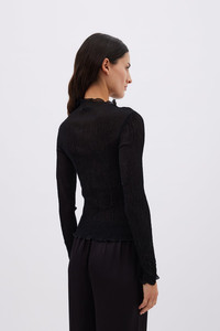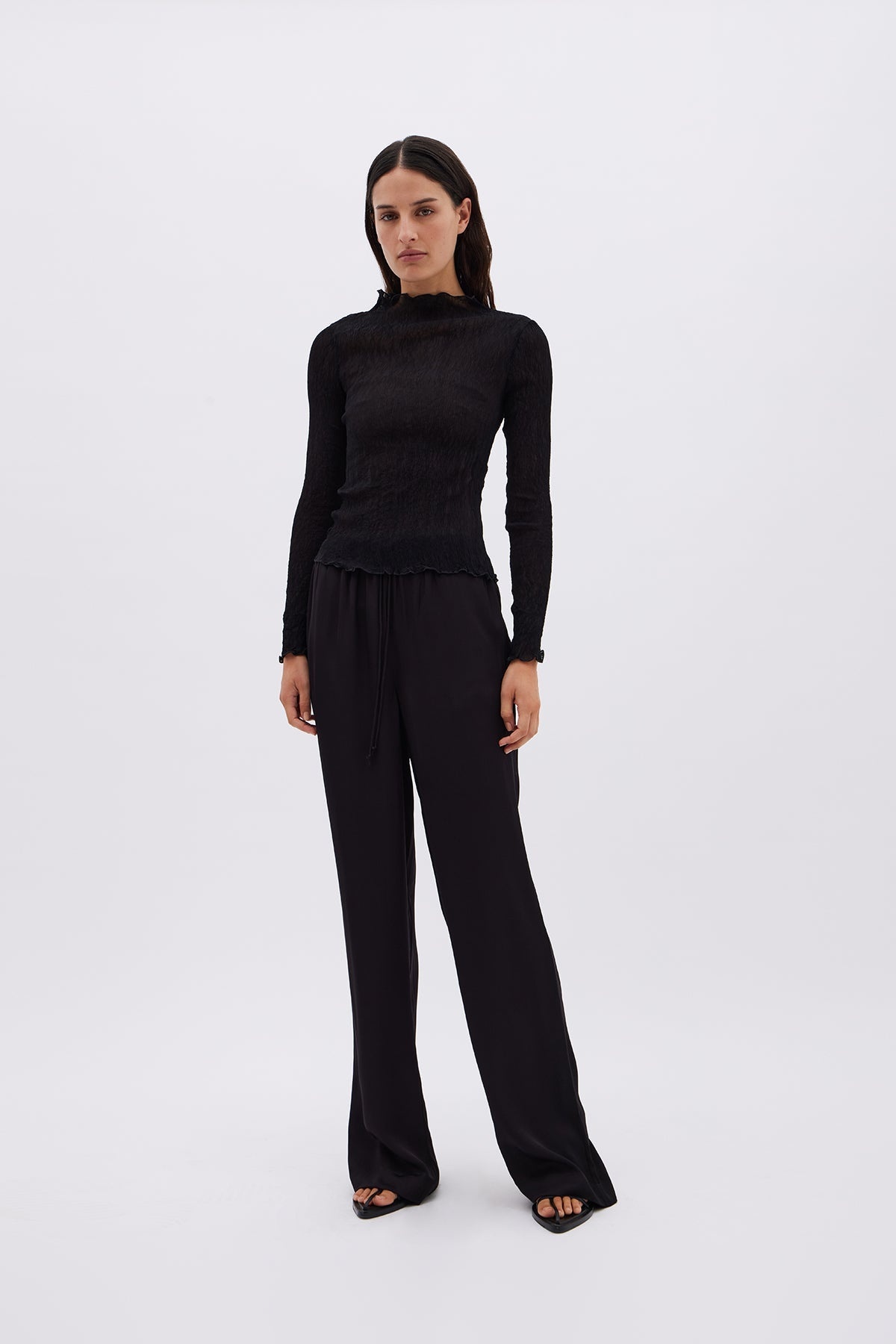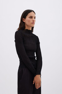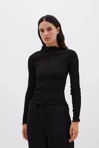 Instantly versatile, the Wilsa top makes the perfect everyday classic. It’s designed in a scrunched and pleated fabric for textural interest. The go-to has a high neck for a pared-back finish. - High shaped neckline - Scrunch plisse georgette - Lettuce hem - Fitted sleeve finishes at cuff - We recommend taking your usual size due to the delicate nature of this fabric Size and Fit Runs true to size, we recommend taking your usual size. Model is 5'10 and wears a Rachel Gilbert Size S [AU/UK 8 | US 4] Fabrication Poly Scrunch Pleat 100% Polyester Care Dry Clean Only See sewn in label for further care instructions