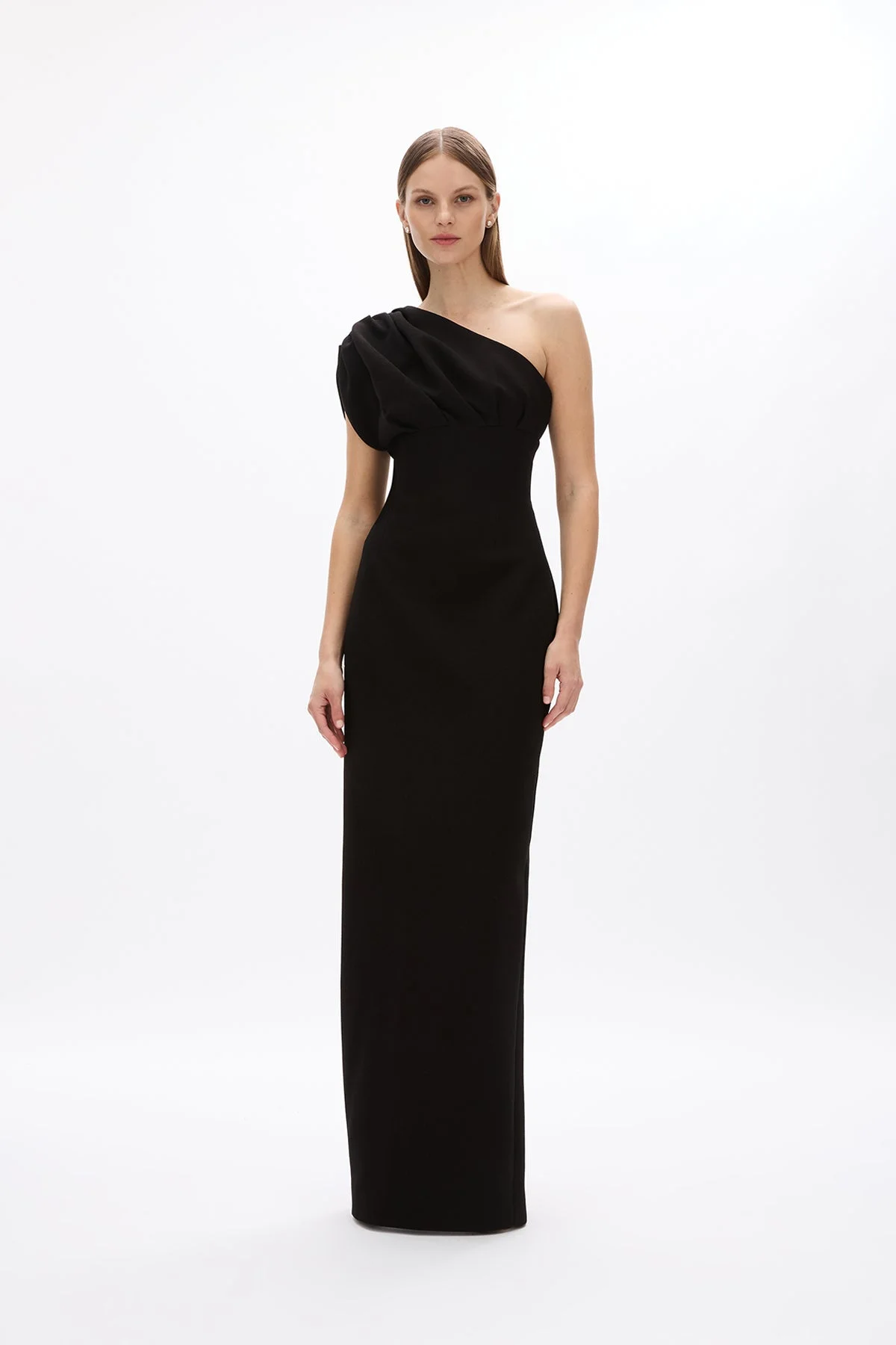 In a nod to timeless elegance, the Winnie Gown features one shoulder detailing and falls to a full-length, straight skirt style. With cinched waist and slight ruching detail across the bust, the Winnie Gown has a feminine and fresh feel. - Internal boning - Shoulder pads - Slight stretch, designed to skim the body - Centre back zip - Centre back split - One shoulder style - Ruched fabric detailing across one shoulder Size and Fit Runs true to size, we recommend taking your usual size. Model is 5'9 and wears a Size 1 Fabrication Moss Crepe 97% Polyester 3% Elastane Care Dry Clean Only See sewn in label for further care instructions