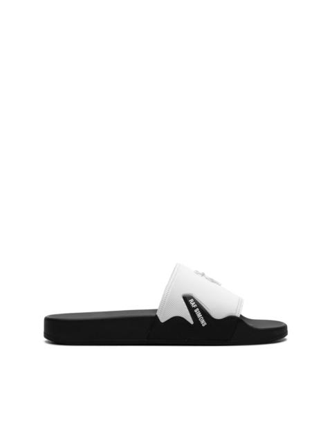 Astra logo-embellished slides Raf Simons' white and black Astra slides are a signature interplay of innovative materials and practical construction. They’re made entirely from waterproof rubber save for the textile lining at the ribbed toe strap and grounded on moulded footbeds. They have logo applique side tabs and a dangling logo charm at the top. Highlights - White/black - Waterproof - Logo charm - Applique logo - Round open toe - Moulded footbed - Textile lining - Flat rubber sole Imported Composition Sole: Rubber 100% SIZE & FIT Measurement HEEL 0.98 in(2.5 cm) Sole height 0.39 in(1 cm)