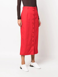 buttoned-up denim midi skirt Channelling a typical silhouette from the noughties, Raf Simons presents this straight denim skirt. The buttoned piece has a vivid red colourway, as the tonal design lends it a more impactful look. Made in Italy Composition Cotton 100% SIZE & FIT Model measurements Height 5 ft 10 in(1.78 m) Bust/Chest 33.07 in(84 cm) Hips 35.82 in(91 cm) Waist 25.98 in(66 cm) FittingInformation This piece fits true to size. We recommend you get your regular size Cut for a slim fit Made with a mid-weight non-stretch fabric Washing instructions Machine Wash