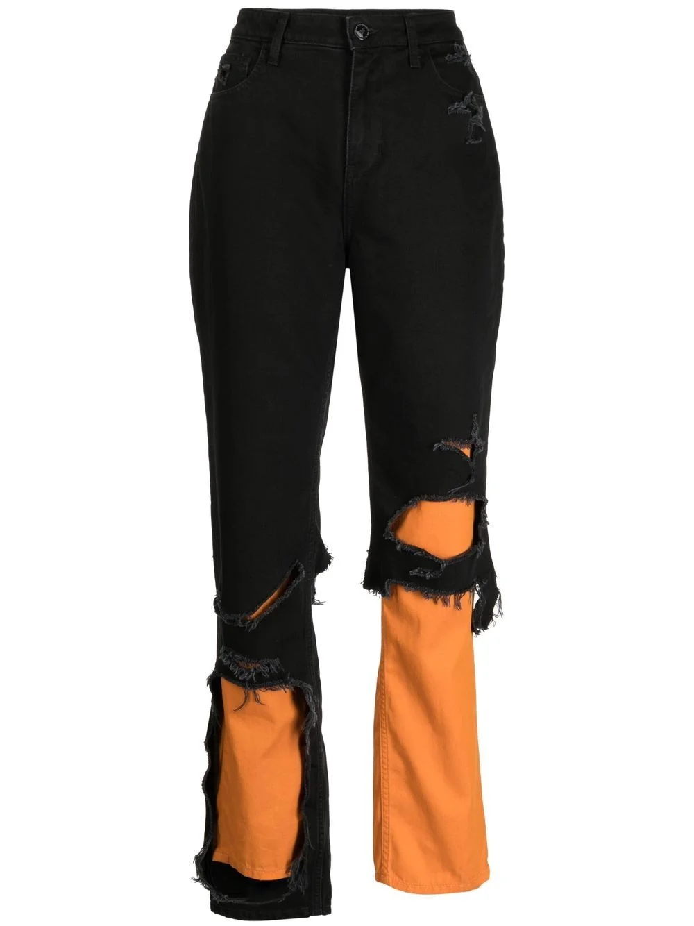 distressed-effect straight-leg jeans Raf Simons' irreverent approach to fashion is shown by the distressed effect of these jeans. This black piece is detailed with ripped details that open to orange panels, offering a bold look. Made in Italy Composition Cotton 100% SIZE & FIT Model measurements Height 5 ft 10 in(1.77 m) Bust/Chest 31.49 in(80 cm) Hips 35.43 in(90 cm) Waist 25.19 in(64 cm) FittingInformation This piece fits true to size. We recommend you get your regular size Cut for a slim fit Made with a mid-weight non-stretch fabric Washing instructions Dry Clean Only