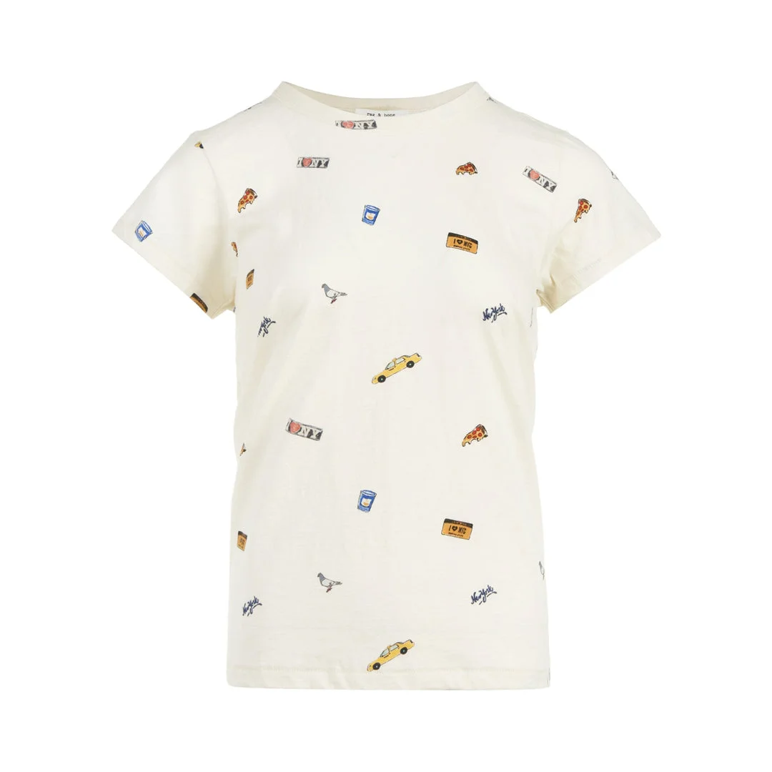300050749OWT-XS / E6RE4E26HTSW/00/ivory multi - Short sleeve crewneck design - All-over NYC themed patch embroidery - Yellow taxi and pizza slice motifs - NYC landmark graphics - Soft cotton jersey construction - Relaxed fit silhouette - Ribbed crew neckline The rag & bone All Over NYC Patch Tee delivers urban streetwear style with authentic New York City iconography scattered throughout. Crafted from soft cotton jersey in classic cream, featuring playful embroidered patches of NYC symbols including yellow taxis, pizza slices, and city landmarks. The relaxed fit and whimsical design capture the brand's downtown aesthetic with contemporary casual appeal.