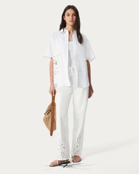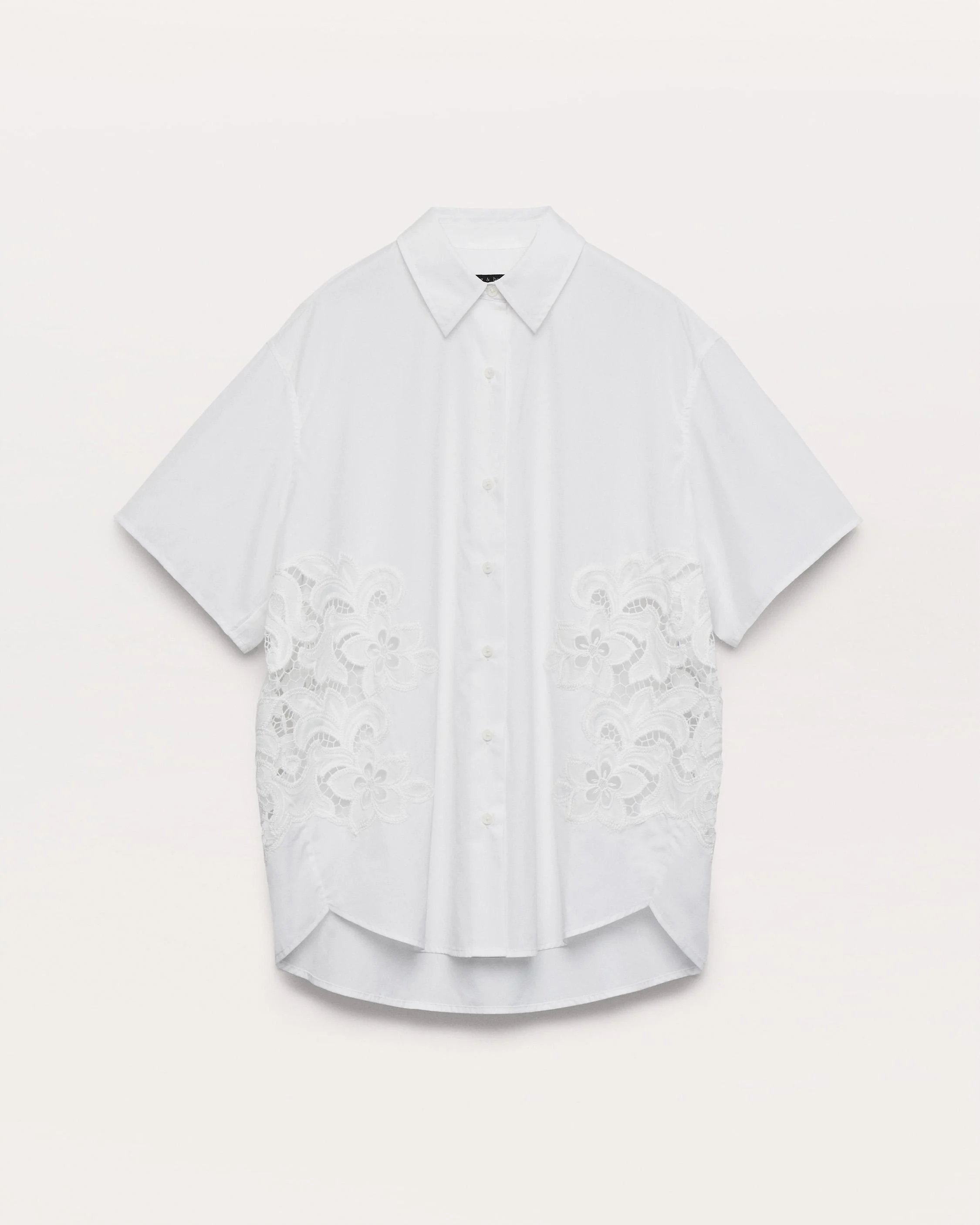 The white shirt, reinvented for the season. Our laid-back take is cut for a long, oversized silhouette from crisp cotton poplin and finished with floral cutout lace panels. Take your typical size for its intended looser look, or size down for a closer fit. Size & Fit • Relaxed fit • Fits large to size. Consider sizing down for a closer fit. • Size Small: back length 30.5 | chest 55.5" | sweep 45.5" | sleeve length 19.5" • Model is 5'11" wearing size small Features & Details • 100% cotton • Faux horn buttons at center front, lace panels at body sides • Unlined • Button closure • Machine wash warm & tumble dry medium • Imported Product ID: WAW25PA0087608