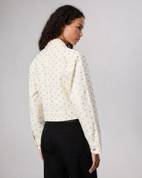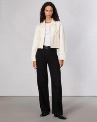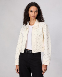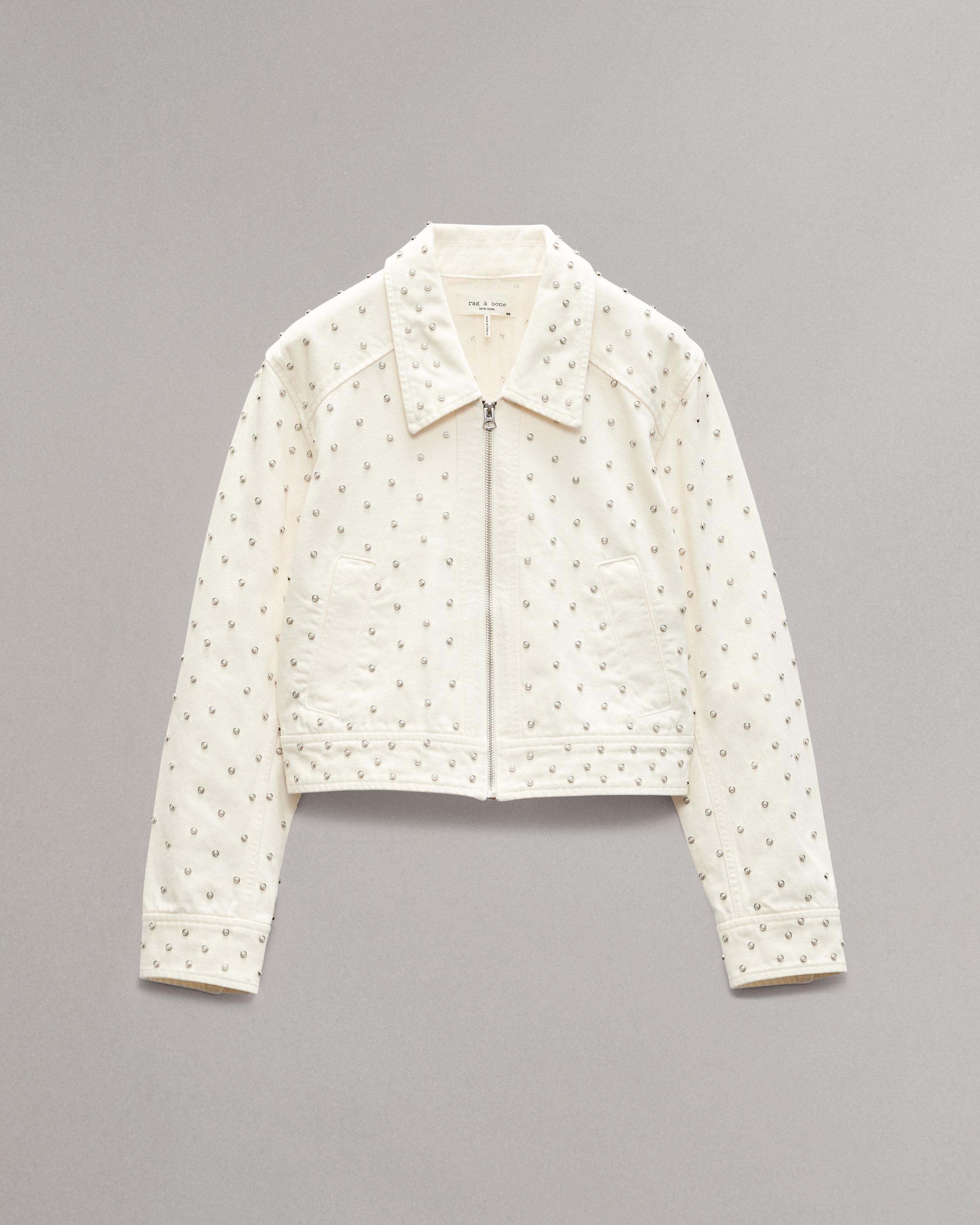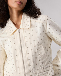 Your classic zip-up trucker jacket, updated with metal-rimmed faux pearls studded throughout. Crafted from Lightweight Rigid non-stretch denim that provides structure, but breaks in over time for a soft and comfortable feel. In Ecru, a cream hue. Size & Fit Fits true to size Size Small: Front length 20 3/4", back length 18 3/4", chest 40 3/4", sleeve length 33" Model is 5'9" wearing size small Features & Details 100% Cotton Unlined Dry clean only Signature center front zipper All over pearl studs Zipper closure Front body welt pocket Imported Product ID: WDD24H1487RGEC