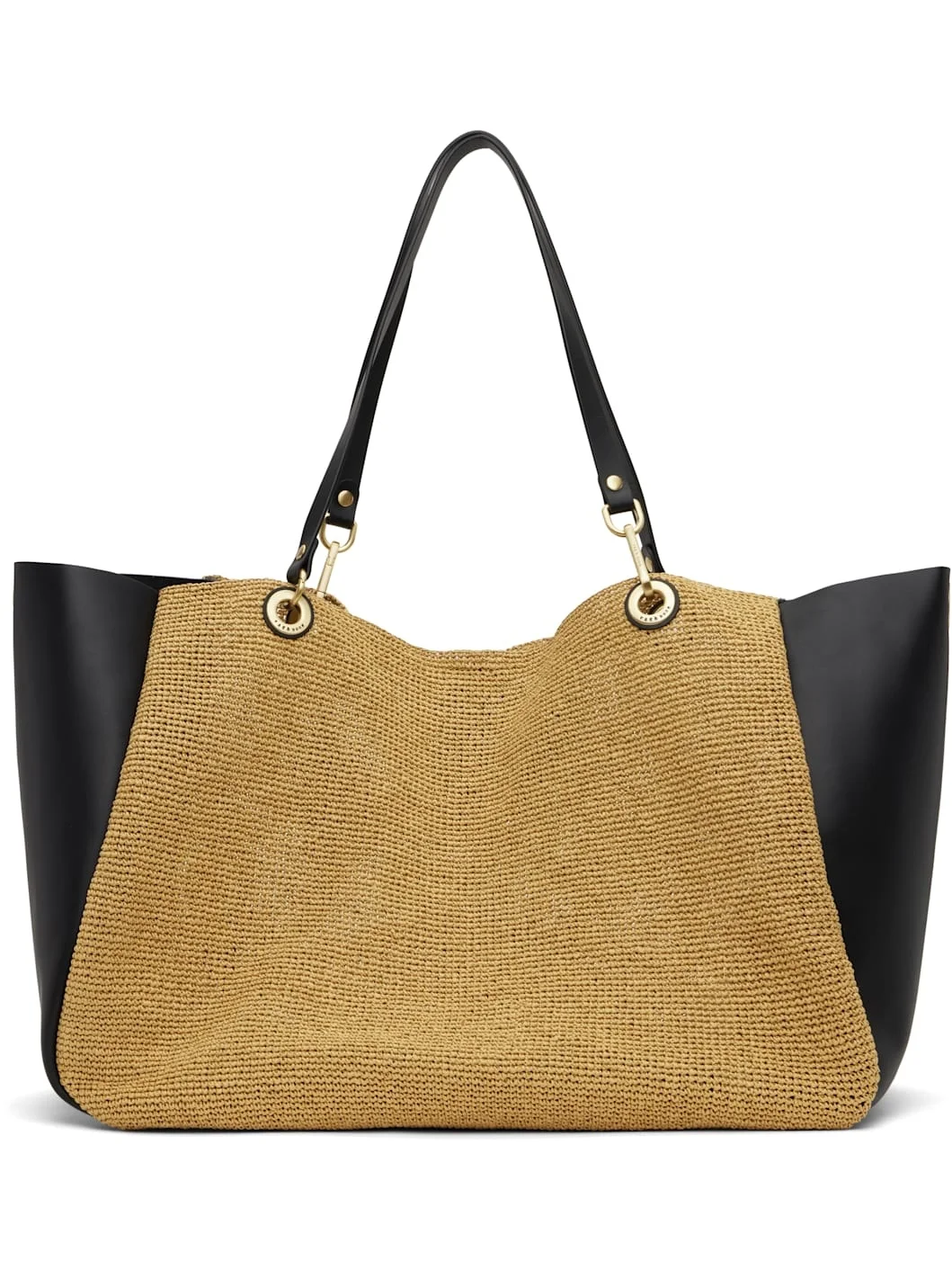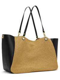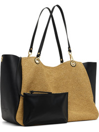 Woven raffia and buffed leather tote in brown and black. · Detachable carry handles · Logo embossed at sides · Press-stud tab at open throat · Detachable zip pouch at interior · Logo-engraved gold-tone hardware · H14" x W17" x D9.5" Supplier color: Natural/Black Body: 100% raffia. Trim: 100% leather. Made in Viet Nam 251055F049007