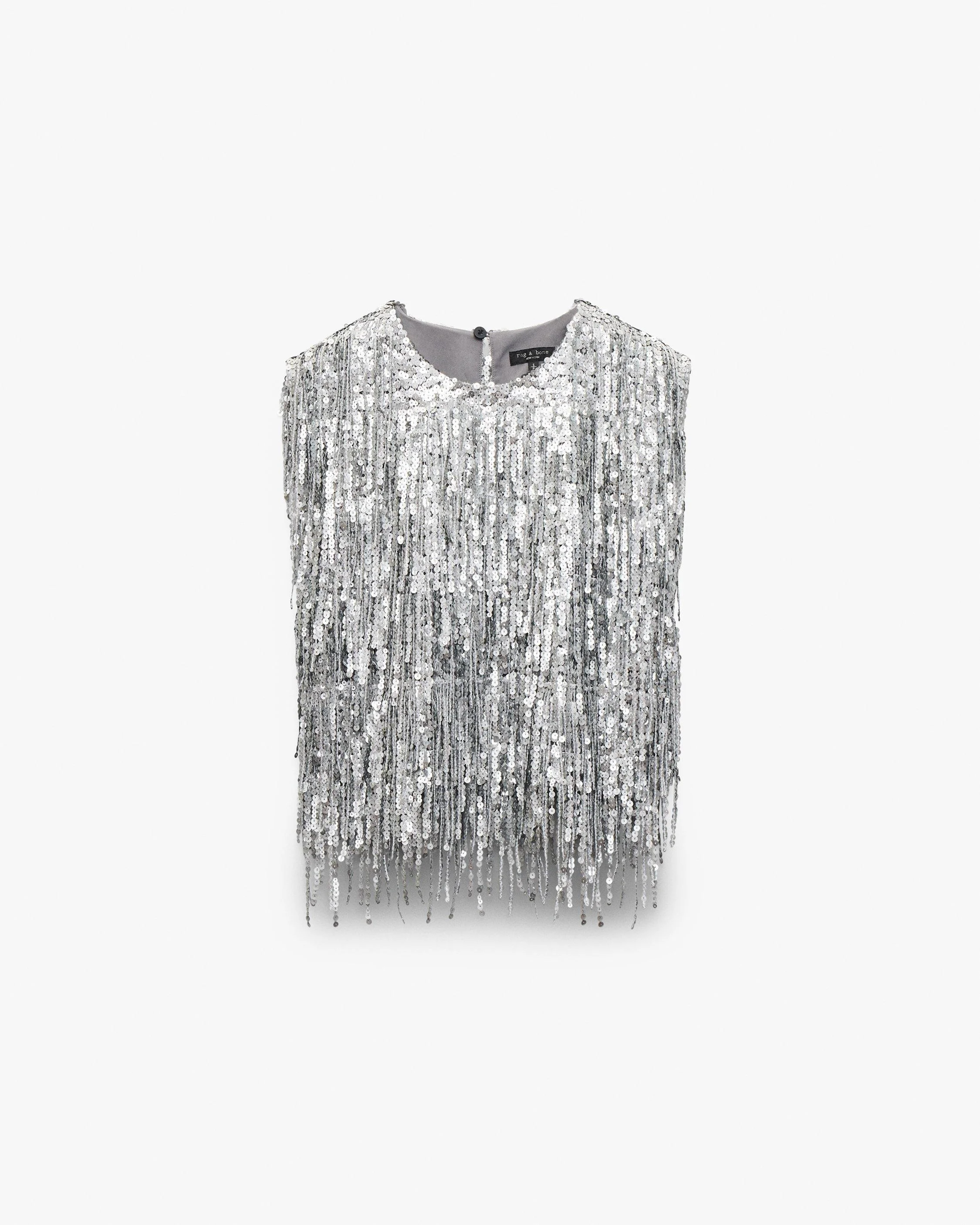 Dynamic sparkle. This classic shell top has capped sleeves and falls around the hips with a tassled, dazzling effect. Dress it down with denim, or up with the matching Billie Sequined Tassel Midi Skirt. Size & Fit • Classic fit • Fits true to size • Size small: Back length 18.25", chest 36.75", sweep 38" • Model is 5'9" wearing size small Features & Details • 100% polyester • Dry clean • Allover sequined fringe • Faux horn button at keyhole back • Fully lined • Imported Product ID: RA2E25FSMSE