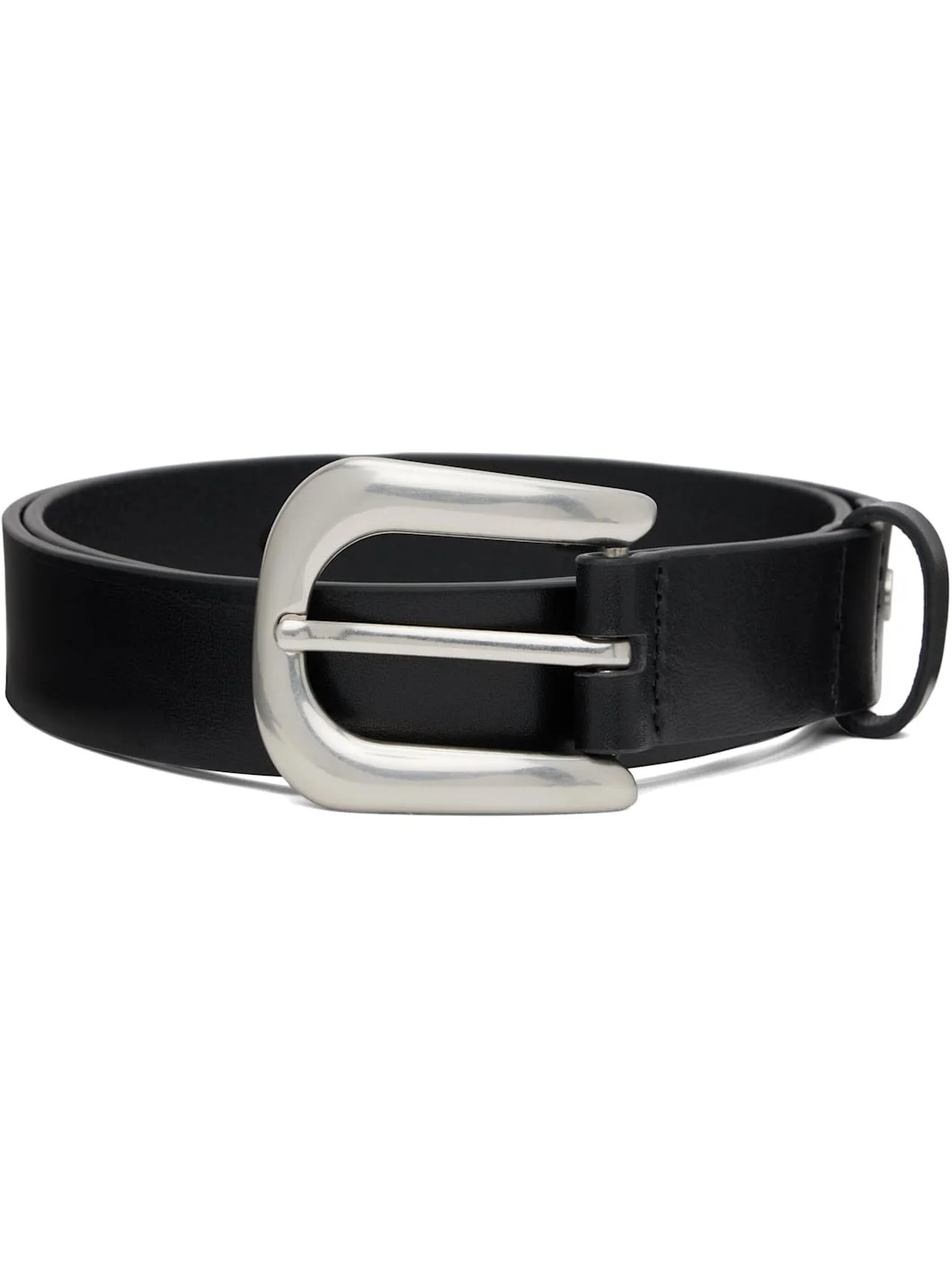 Buffed leather belt in black. · Rivet and keeper loop at length · Pin-buckle fastening · Logo-engraved silver-tone hardware · W1.5" Supplier color: Black Leather. Made in Viet Nam 252055F001013