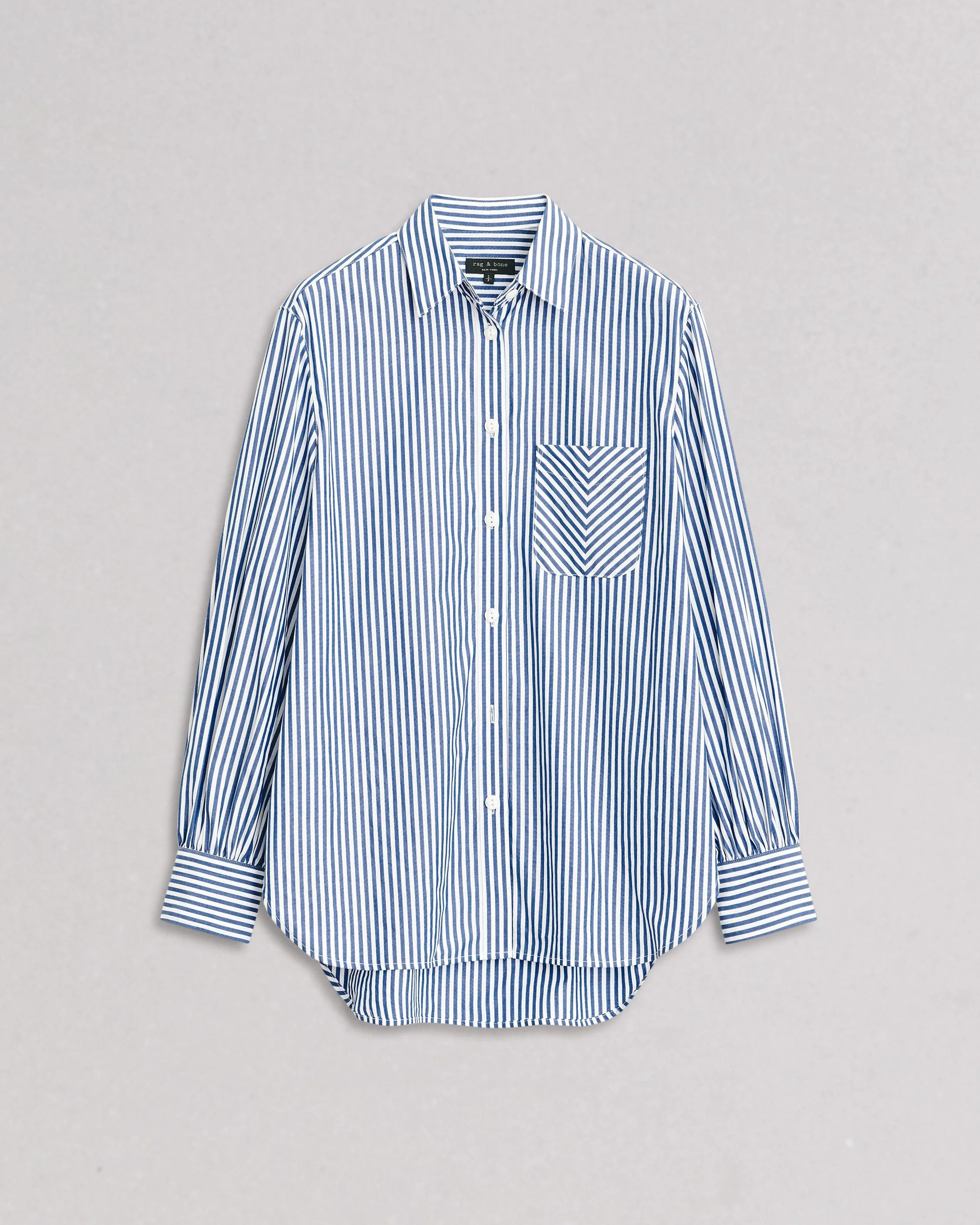 Timeless. Authentic. Iconic. One of the building blocks of a perfect wardrobe. A true wardrobe staple, this poplin button down Icon is a classic, perfected. Featuring banker stripes and a chevron front pocket detail for added dimension. Subtle gathering around the cuffs gives this traditionally masculine shirt a subtly feminine touch. Pairs perfectly under a sweater-vest or military jacket. Crafted from 100% cotton with a relaxed fit. Size & Fit Relaxed fit Size Small: Center back length 30 7/8", chest 44 1/2", sweep 45", sleeve length 32 3/4" Model is 5'9.5" wearing a size small Features & Details 100% Cotton Machine wash cold, do not bleach, low iron if needed, wash with like colors, tumble dry low, dry clean if necessary Fisheye buttons Front button closure Made in Vietnam Product ID: WAW22FA050ZE50
