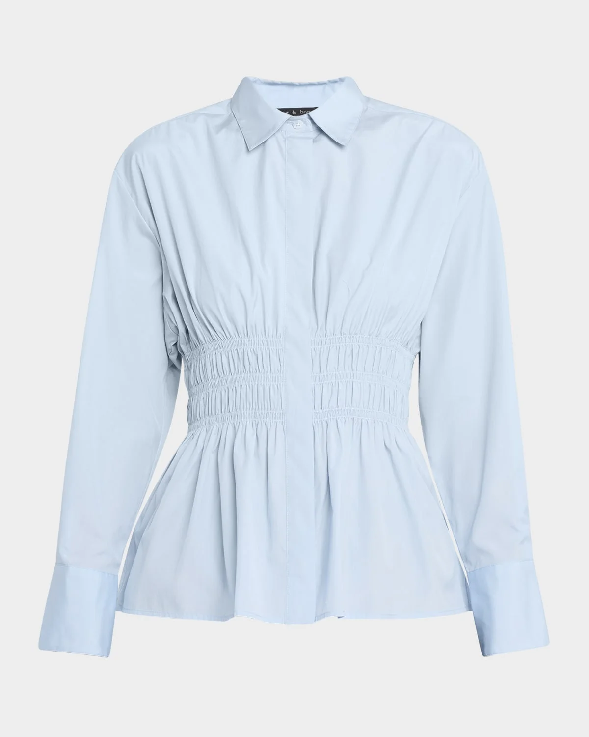 - Rag & Bone "Blythe" crisp cotton poplin shirt with a smocked waist - Point collar - Long sleeves with button cuffs - Classic fit - Hem falls to the hip - Concealed button-front - Cotton - Machine wash warm - Imported