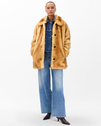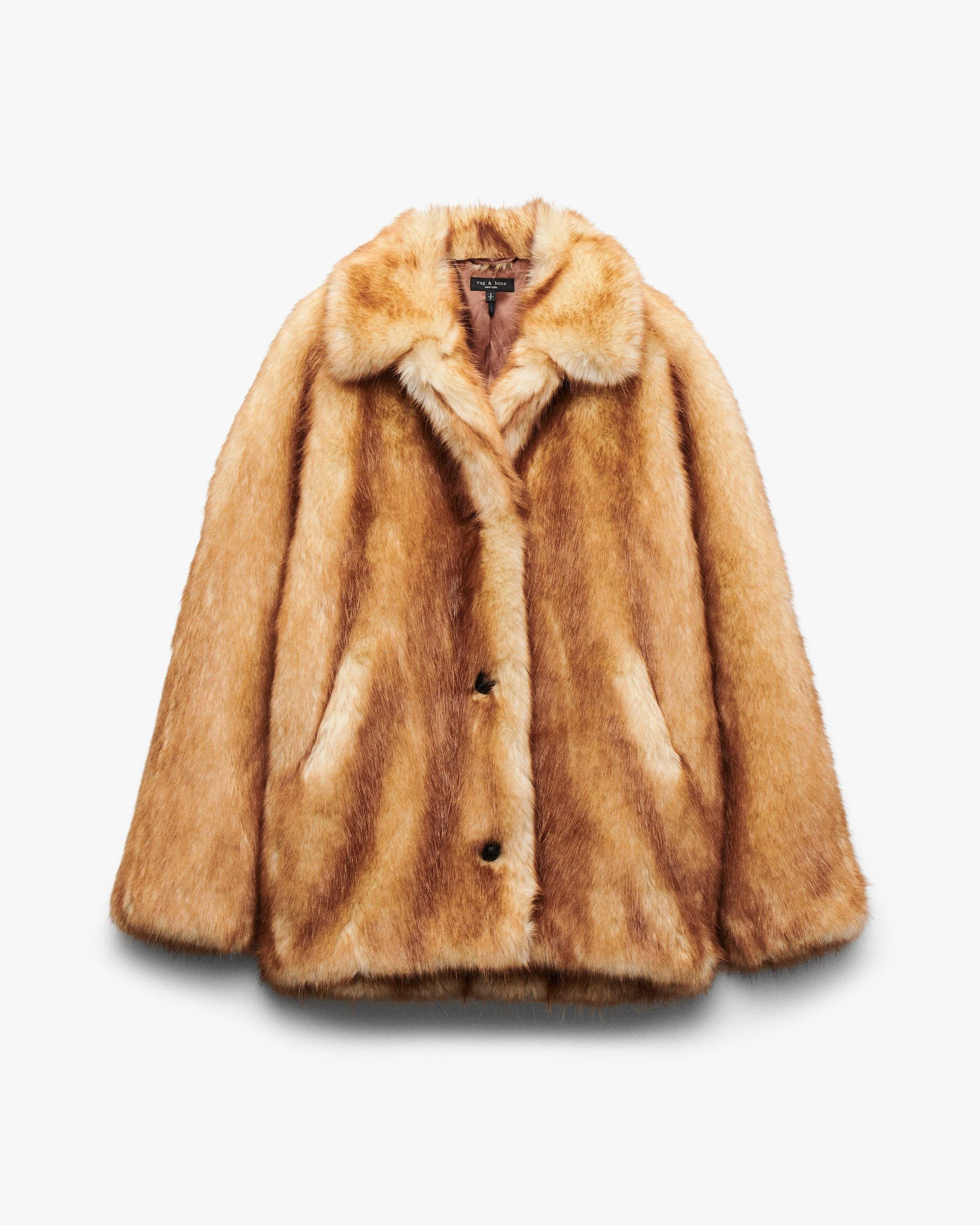 Statement style. An oversized jacket silhouette that hits below the hip. Made from ultra-soft faux fur, this bold layer has front button closure and is fully lined, making it easy to slip over everything from denim to sparkles. Size & Fit • Oversized fit, hits below hip • Fits large to size. Consider sizing down for a closer fit. • Size small: Front length 29.5", back length 29", chest 43.5", sleeve length 31.75" • Model is 5'9" wearing size small Features & Details • Body: 55% modacrylic, 45% acrylic • Lining: 55% polyester, 45% viscose • Facing & undercollar: 100% cotton • Dry clean only • Leather dome buttons at center front • Front pockets • Button closure • Imported Product ID: RA9225F4M97