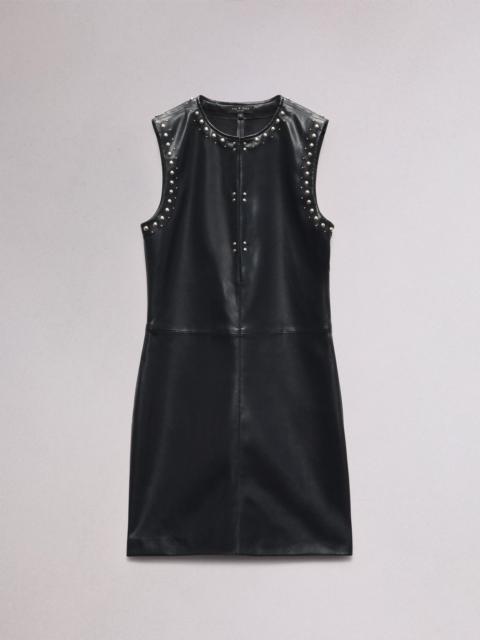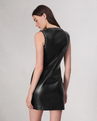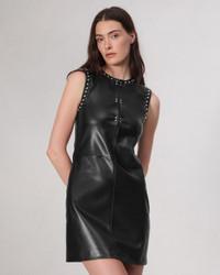 The Brigette. Outlining a notched neckline and a sleeveless silhouette with metal studs, our mini dress is zipped up the side in stretch faux leather. Size & Fit Slim fit Size 4: Front length 34", chest 34 1/2", sweep 40" Features & Details 100% Polyester with Polyurethane coating Professional leather clean only. Decorative studs at neckline and armhole Two metal hook & bars at center front Unlined Invisible zipper at side seam Imported Product ID: WAW24F30135113