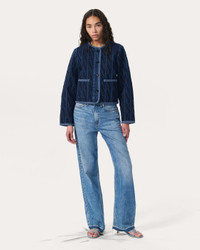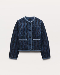 Heritage outerwear, done the rag & bone way. This lightweight layer fuses the profile of a classic lady jacket with medium-dark indigo denim featuring custom cable-embroidered quilting. It's crafted from Lightweight Rigid non-stretch denim and is fully lined and filled for a touch of warmth. Size & Fit • Classic boxy lady jacket, hits above the hip • Fits true to size • Size Small: Front length 21.5", center back 21", chest 38.5", sleeve length 31.5" • Model is 5'9" wearing size small Features & Details • Body and Lining: 100% cotton • Fill: 100% polyester • Hand wash cold inside out & lay flat to dry • Do not dry clean • Quilted embroidery on self fabric, polyfill filling, faux horn buttons at center front, knit trim binding at edges and pockets, fully lined • Hip patch pockets • Front button closure • Imported Product ID: WAW25P20074507