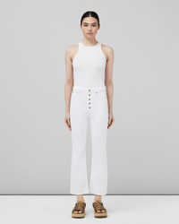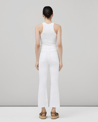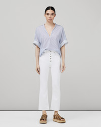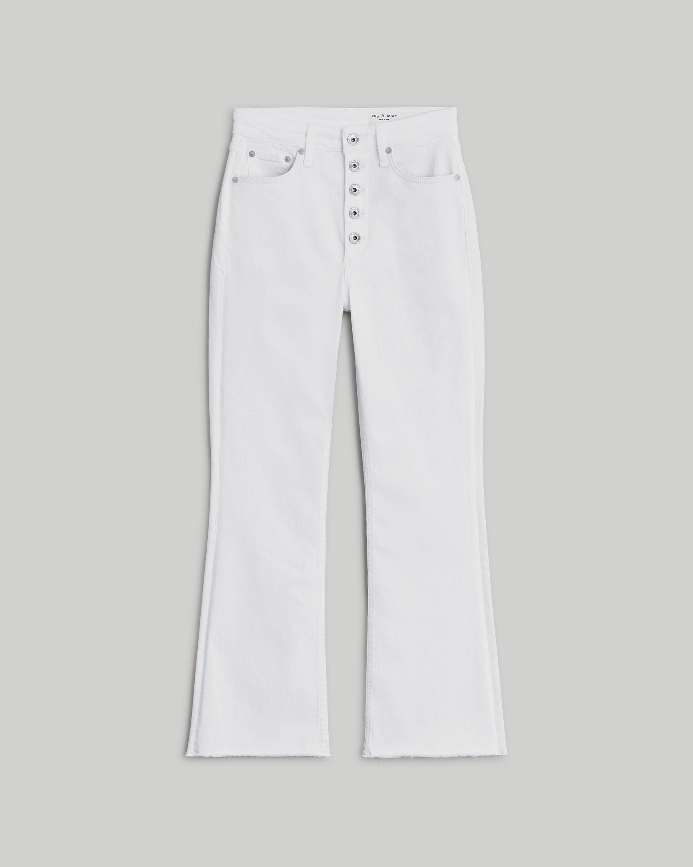 The perfect flare gets cropped. Casey is our ultra slimming flare jean, ideal for a dressed up or casual look. Crafted from stretch fabric for a supreme fit and feel. Available in Optic White with a button-fly. Size & Fit High-rise flare leg, ankle length Size 26: 11 1/2 " rise, 27" inseam, 18" leg opening Features & Details 77% Organic Cotton 16% Lyocell 5% Polyester 2% Elastan Stretch fabric, white Machine wash cold inside out with like colors. Do not use bleech. Hang to dry. Do not iron. Zip front washer rivet. Cut hem Five- pocket silhouette Imported Product ID: WDD23S2937BROW