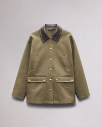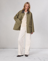 The Cassidy. Fully lined, this jacket has a relaxed silhouette with dropped shoulders and full sleeves. It's crafted in a midweight cotton with a pointed faux leather collar. Size & Fit Relaxed fit Size Small: Front length 29 5/8", back length 28 1/2", chest 49", sleeve length 32 1/2" Model is 5'7.5" wearing a size small Features & Details Body: 100% Cotton Lining: 51% Viscose 49% Polyester Combo: 100% Polyester with 100% Polyurethane coating Dry clean only. Faux leather top collar Fully lined Chest welt pockets, hip welt pockets with flap and exposed snap closure Imported Product ID: WAW24F20167516