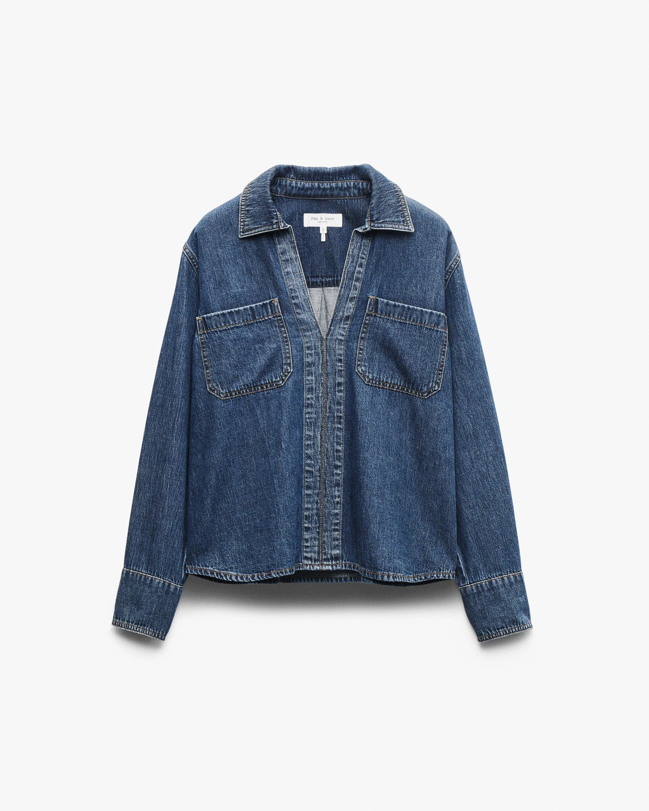 A V-neck, long-sleeve shirt that borrows details from classic tailoring. Crafted from Lightweight Rigid non-stretch denim that provides structure, but breaks in over time for a soft and comfortable feel. In Kennmore, a dark indigo wash. Size & Fit • Classic fit • Fits true to size • Size small: Back length 25", chest 45", sweep 45" • Model is 5'10" wearing size small Features & Details • 100% cotton • Machine wash cold inside out on delicate & lay flat to dry • Color may bleed • Signature metal corozo buttons at cuff • Imported Product ID: RJ0525FSUKE