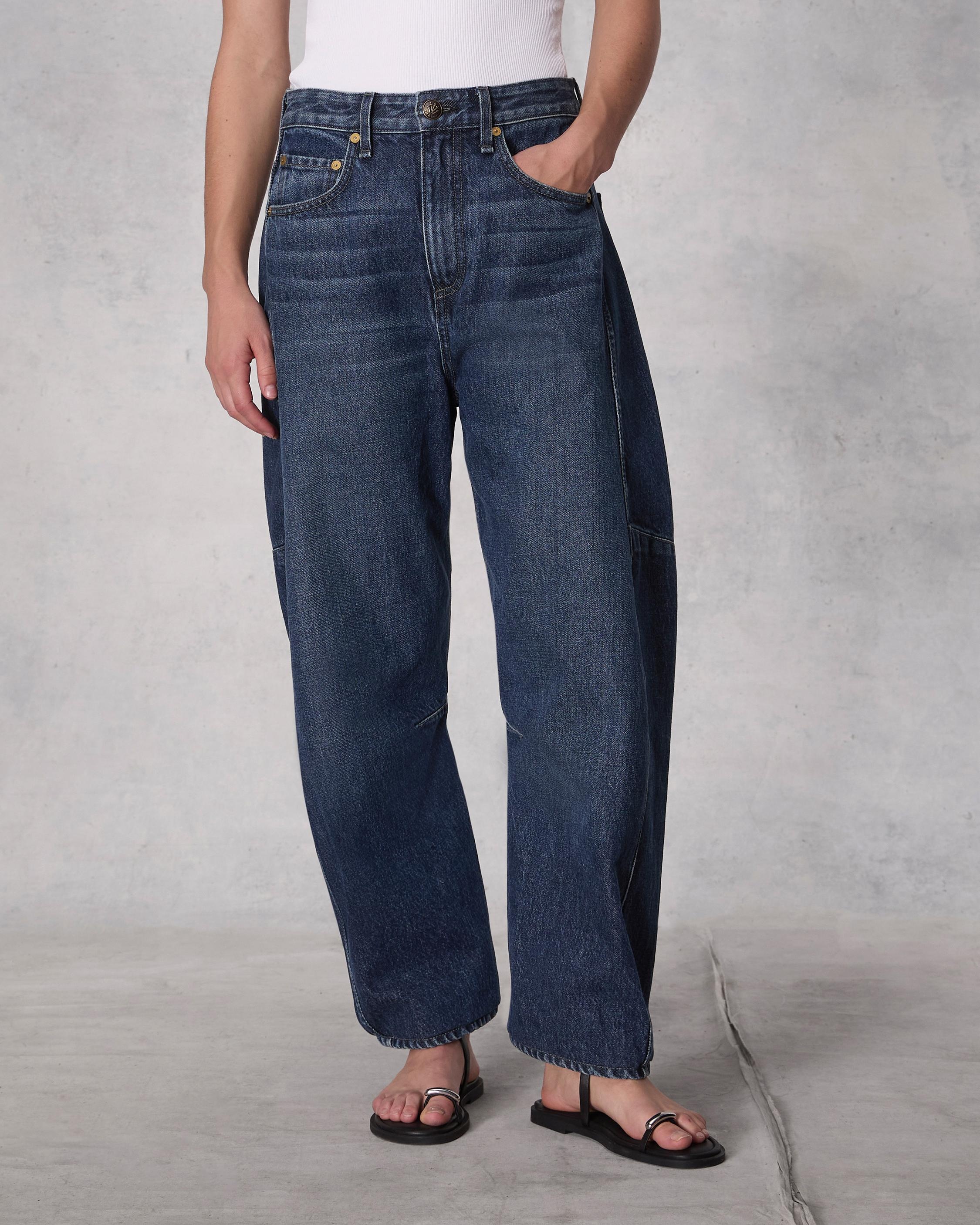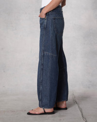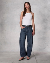 The Charlie. The perfect update to your denim lineup, defined by an exaggerated barrel shape with a relaxed, looser fit and a slight tapered curve that hits at the ankle. Crafted in Lightweight Rigid non-stretch denim that provides structure, but breaks in over time for a soft and comfortable feel. In Teo, a dark indigo wash with a clean hem. Size & Fit High-rise, barrel leg, ankle length Size 26: 13 1/4" front rise, 25 1/2" inseam, 17 1/2" leg opening Model is 5'8" wearing a size 25 Features & Details 100% Cotton Lightweight rigid, dark indigo wash Machine wash cold, gentle cycle, inside out with like colors, hang to dry, low iron if needed, color may transfer Signature dagger shank button at center front with a zipper fly, metal rivets Five-pocket silhouette Imported Product ID: WDD24P2994AZTE