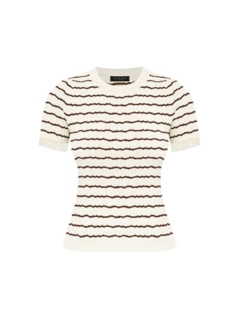 striped frilled-sleeve top Highlights - Navy blue - Horizontal stripes - Ribbed knit - Short sleeves - Frilled sleeve trim - Round neck Imported Composition Cotton 50%, Polyamide 49%, Spandex/Elastane 1% Washing instructions Read Manufacturer Guidelines