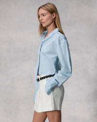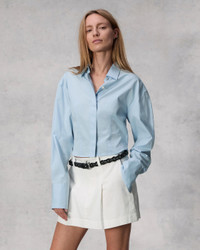 The Claudia. Lightly darted in a crisp cotton poplin, our cropped version of the quintessential shirt is detailed with a hidden button placket for a clean look. Size & Fit Classic fit, hits above the hip Size Small: 35 1/4" chest, 19 3/4" back length, 32" sweep, 34 1/4" sleeve length Model is 5'7.5" wearing a size small Features & Details 100% Cotton Wash before wear, machine wash warm with like colors, only non-chlorine bleach when needed, tumble dry medium, warm iron if needed Buttons at center front Hidden placket and cuffs Metal button at collar Unlined Imported Product ID: WAW24PA0034603