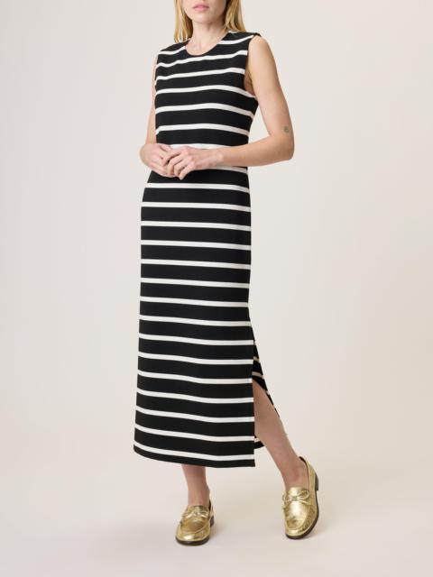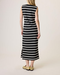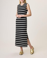 Easy stripes for everyday wear. Knit from a lightweight stretch yarn, this sleeveless midi dress features bold horizontal stripes and clean, minimalist lines. The straight silhouette and side slits add ease of movement, while the high neckline keeps the profile polished. An effortless one-and-done piece for warm days ahead. Features & Details • 74% Polyester, 21% Viscose, 5% Elastane • Machine wash cold, gentle cycle, do not bleach, tumble dry low, low Iron if needed or dry clean • Imported Product ID: WAC24H3052OC52