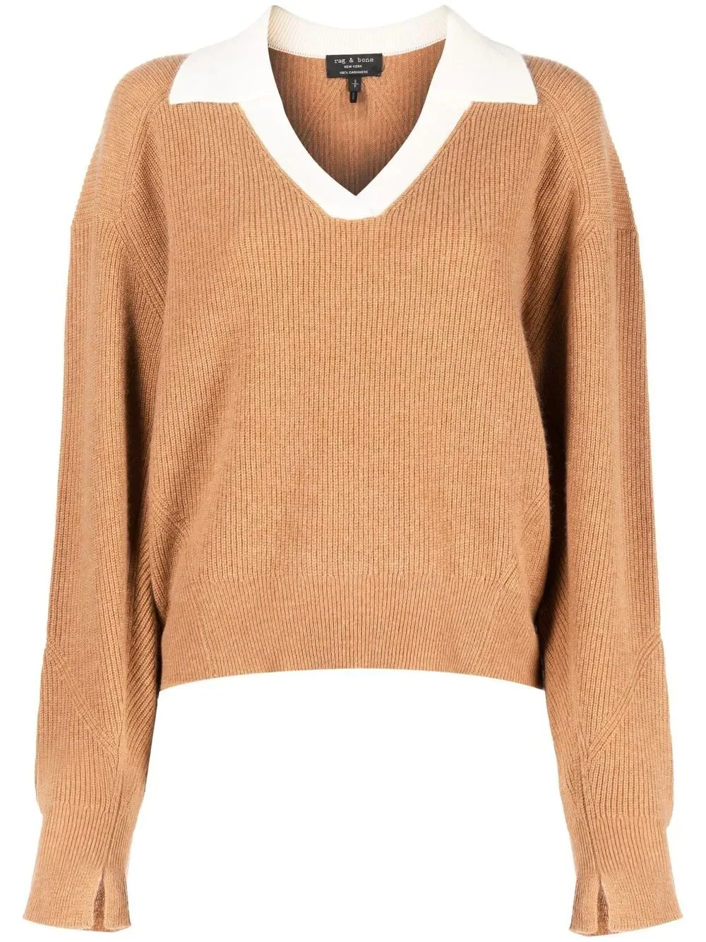 collared cashmere jumper collared cashmere jumper from RAG & BONE featuring camel brown, cloud white, cashmere, fine knit, polo collar, long sleeves and ribbed hem. Imported Composition Cashmere 100% SIZE & FIT Model measurements Height 5 ft 9 in(1.74 m) Bust/Chest 32.28 in(82 cm) Hips 35.82 in(91 cm) Waist 24.01 in(61 cm) FittingInformation This piece fits true to size. We recommend you get your regular size Cut for a loose fit Made with a mid-weight fabric Washing instructions Dry Clean Only